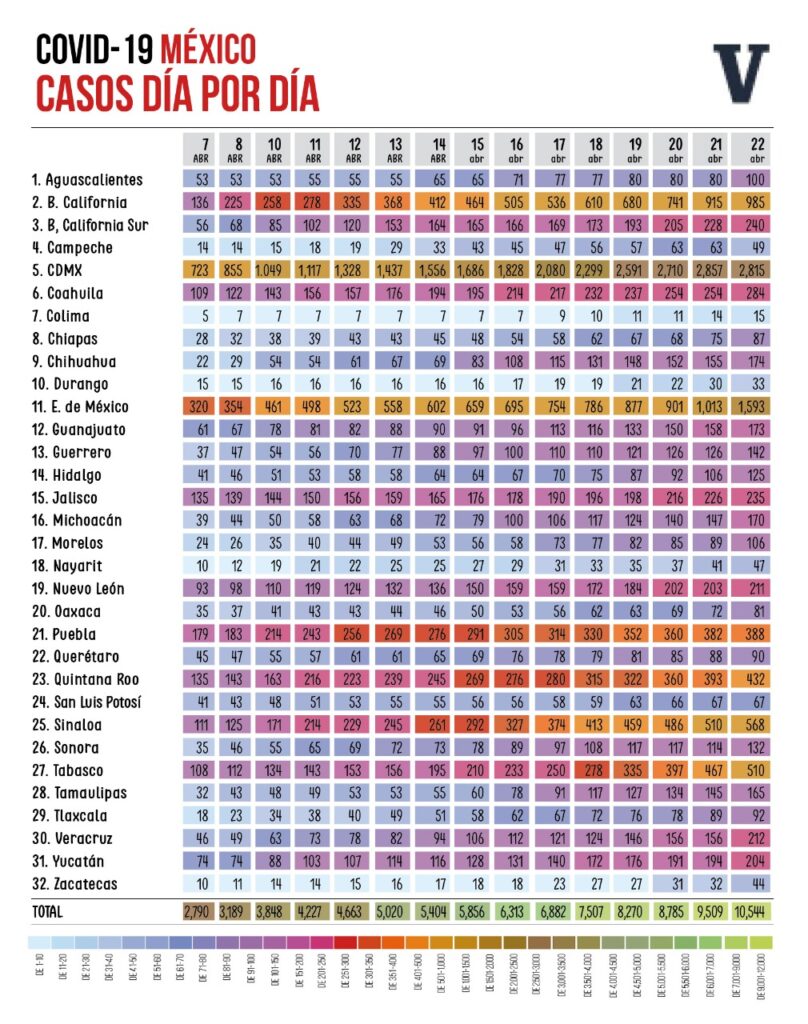 Redacción / La Voz de Michoacán Ciudad de México. En el último día se reportaron en México 1,043 contagios nuevos, así como 113 fallecimientos, con lo que el país llega a 10,544 casos confirmados acumulados, de los cuales 970 han muerto y 3,618 permanecen activos, el resto ya se ha recuperado, informó el subsecretario de Prevención y Promoción de la Salud de la Secretaría de Salud federal (Ssa), Hugo López-Gatell Ramírez. El funcionario explicó que los casos activos son los confirmados positivos que comenzaron con los síntomas de la enfermedad de COVID-19 en los últimos 14 días, y es en estos donde se centra la atención de las autoridades sanitarias para el tratamiento a la pandemia, pues son los que mantienen la transmisión. Fuente: Dirección General de Epidemiología. Diseño: Enrique Santiago y Elizabeth Zavala, La Voz de Michoacán. Las entidades que tienen más casos activos son la Ciudad de México (1,085), el Estado de México (584), Baja California (300), Tabasco (226), Sinaloa (206) y Quintana Roo (111). Por casos acumulados, los estados que registran más casos desde el inicio de la enfermedad en el país son la Ciudad de México (2,815), Estado de México (1,593), Baja California (985), Sinaloa (568) Tabasco (510), Puebla (388), Quintana Roo (432) y Coahuila (284). La tasa de incidencia nacional de casos activos es de 2.83 por cada 100 mil habitantes, y por entidad de residencia los estados que reportan más casos son Ciudad de México (12.03), Tabasco (8.78), Baja California (8.25), Sinaloa (6.52), Quintana Roo (6.44), Baja California Sur (5.59), Estado de México (3.35) y Tamaulipas (2.68). De las 970 defunciones que han ocurrido en el país, 69 por ciento son hombres y 31 por ciento mujeres, con una edad promedio de 59 años, pues la persona más joven en morir en el país era un menor de 1 año y la de mayor edad tenía 99 años. Fuente: DGE. Diseño: Enrique Santiago, La Voz de Michoacán. Fuente: DGE. Diseño: Enrique Santiago, La Voz de Michoacán.