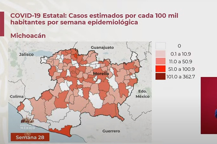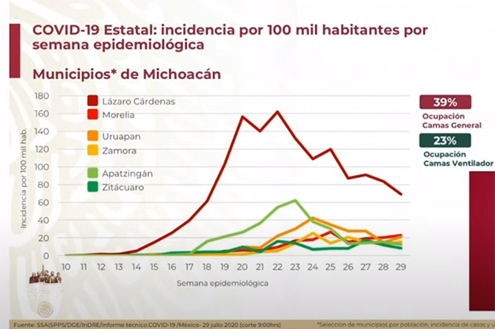 Casos acumuladosConfirmadosRecuperadosMuertesLázaro Cárdenas2,7062,344139Morelia1,38498099Uruapan88870171Huetamo47842730Apatzingán45838439Múgica34428253 La Voz de Michoacán te presenta todas las noches el último reporte de la Secretaría de Salud de casos de COVID-19 Juan Carlos Huante / La Voz de Michoacán Morelia, Michoacán. La entidad michoacana registró 174 contagios nuevos en un día, mientras que fueron 15 decesos más respecto al corte del martes. Al corte de este miércoles, Michoacán acumula 9 mil 555 casos positivos de COVID-19 y 713 fallecimientos a causa de la enfermedad. La capital michoacana vuelve a ser el municipio con más personas infectadas en las últimas 24 horas, al reportarse este miércoles 33, pero en Pátzcuaro los casos se dispararon, al reportarse 28; Zitácuaro registró 15 nuevos contagios y Apatzingán 10. Gráfica presentadas en el reporte nacional. En el reporte técnico del desarrollo del COVID-19 en Michoacán, destaca el municipio de Lázaro Cárdenas, que al ser considerado el centro de la pandemia del virus en el estado, este miércoles se fue en blanco en cuanto a casos positivos, aunque sí registró un deceso. Gráfica presentadas en el reporte nacional. En cuanto a los fallecimientos, en la capital michoacana ocurrió el mayor número, con 5, mientras que Uruapan reportó 3, Zamora 2, y con un deceso, La Huacana, Zacapu, Copándaro y Quiroga. A la fecha se mantienen mil 435 personas con el virus activo, en tanto que los recuperados, el número asciende a 7 mil 407. En el mapa nacional, Michoacán ocupa la posición 16 en cuanto al número de congatios y en el 21 en defunciones. Gráfica presentadas en el reporte nacional. Los 14 municipios que mantienen la alerta de alto riesgo, con Bandera Amarilla, son Morelia, La Huacana, Apatzingán, Múgica, Pátzcuaro, Huetamo, Puruándiro, Sahuayo, Zitácuaro, Zacapu, Lázaro Cárdenas, Parácuaro, Zamora y Uruapan.