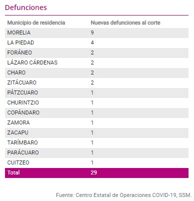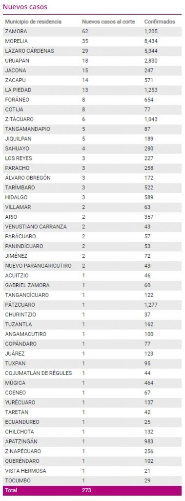 Casos acumulados Confirmados Recuperados Muertes Morelia8,4347,292663Lázaro Cárdenas5,3444,923326Uruapan2,8302,482270Pátzcuaro1,2771,14581La Piedad1,2531,14164Zamora1,205963114 Osiris Olachea / La Voz de Michoacán Morelia, Michoacán. Este sábado Michoacán registró el número más alto de contagios nuevos de COVID-19 en todo lo que va de la epidemia: 273 personas dieron positivo a coronavirus en las últimas 24 horas en 46 municipios del estado. Zamora, Morelia, Lázaro Cárdenas y Uruapan reportaron más casos nuevos y concentran más de la mitad de los notificados hoy en el corte epidemiológico de la Secretaría de Salud de Michoacán (SSM). También en el último día se notificó la muerte de 29 personas más por complicaciones de la enfermedad, la mayoría de ellas en Morelia (9); seguido de La Piedad (4); Lázaro Cárdenas (2); Charo (2) y Zitácuaro (2), así como otros ocho municipios que sumaron un deceso más cada uno: Pátzcuaro, Churintzio, Copándaro, Zacapu, Zamora, Tarímbaro, Parácuaro y Cuitzeo, además de dos casos foráneos. Hasta hoy han muerto 2 mil 835 personas en todo el estado debido al COVID-19, pero 30 mil 185 se han recuperado al padecimiento, lo que representa 86 por ciento de todos los casos positivos al virus SARS-CoV-2 en el territorio michoacano. Sin embargo, hay mil 759 casos activos, que son las personas que en las últimas tres semanas se infectaron con el nuevo virus y comenzaron manifestar los síntomas propios de la enfermedad —como dolor de cabeza, tos y fiebre, principalmente—, por lo que pueden contagiar a otros. Además, las autoridades sanitarias tienen identificados 2 mil 55 casos sospechosos, es decir, personas que podrían haberse contagiado, pero que no se confirmó a través de las pruebas correspondientes. Este sábado, Zamora es el municipio que reportó el mayor número de casos nuevos: tiene 62 más, con los cuales llega a mil 205 acumulados, y de estos, 114 han fallecido, 963 se han recuperado y 128 son casos activos. Es la sexta demarcación en el estado más afectada por la epidemia. Morelia sumó hoy 35 positivos y 9 defunciones, para alcanzar 8 mil 434 casos totales, de los cuales 663 han muerto, 7 mil 292 ya superaron la enfermedad y 479 todavía la padecen. La capital michoacana es la región del estado con más fallecimientos, más casos positivos y más casos activos (479), lo que motivó a los gobiernos estatal y municipal a anunciar hoy nuevas medidas para frenar la propagación del virus, pues van en aumento tanto los contagios como las hospitalizaciones en la ciudad. Por lo anterior, a partir de este sábado iniciarán las acciones con las que se busca reducir las actividades de la ciudadanía en espacios públicos y comercios de Morelia, entre las cuales está el cierre de todo tipo de giros comerciales y de servicios a las 19:00 horas todos los días de la semana lo que resta de enero. El lunes 1 de febrero se hará una evaluación de los resultados de estas medidas y se considerará si se levantan, se ajustan o se extienden. También se acordó el cierre total de todos los giros comerciales, de servicios y espectáculos las 24 horas de todos los domingos de enero, con excepción de farmacias, consultorios médicos, gasolineras, gaseras, velatorios y todos los establecimientos de atención médica. El uso de cubrebocas es obligatorio en todo espacio público y de manera particular en el transporte público, plazas comerciales, mercados, tianguis y paradas de autobuses. Se permitirá solo un aforo de 30% en los centros deportivos y quedan prohibidos todos los juegos de contacto. Además, continúa sin autorización la realización de espectáculos públicos, jaripeos, las fiestas privadas o patronales masivas y las reuniones en calles y plazas públicas que rebasen el número de 30 personas. Aumenta hospitalización Los hospitales de la Secretaría de Salud de Michoacán (SSM) que fueron reconvertidos para atender a pacientes con COVID-19 registran un aumento en la ocupación de camas, que va de 50 a 100 por ciento. Los hospitales de La Piedad, Civil de Morelia, Pátzcuaro, Zamora y Sahuayo reportan mayor ocupación de camas para la atención de pacientes COVID-19 con 100, 96, 66, 55 y 50 por ciento de su capacidad resolutiva, respectivamente. Para evitar la saturación de las unidades médicas, el gobierno del estado llamó a la población a la corresponsabilidad social para la implementación de medidas preventivas emitidas por las autoridades sanitarias. La SSM hizo un llamado a extremar cuidados durante esta temporada invernal, a fin de evitar contagios por COVID-19 y otras enfermedades respiratorias, por lo que es importante el uso de cubrebocas, sana distancia y lavado o desinfección permanente de manos, así como el evitar reuniones en espacios tanto públicos como privados. La institución mantiene a disposición de la ciudadanía la línea 800-123-2890, en la cual se brinda orientación sobre COVID-19 y la unidad médica más cercana con capacidad resolutiva.