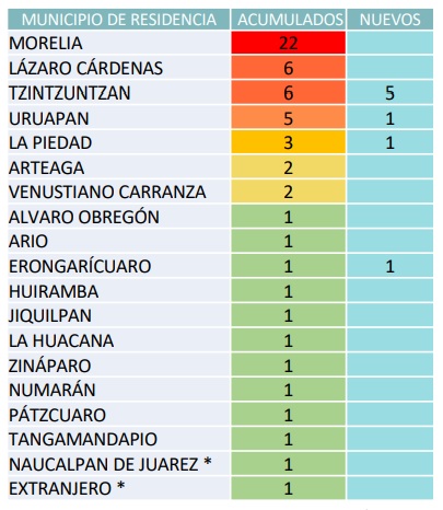 Osiris Olachea / La Voz de Michoacán Morelia, Michoacán. En Michoacán se reportaron 8 casos confirmados más de COVID-19 y otro deceso, con lo que los contagios acumulados llegaron a 58 y las muertes a 8, informó el Comité Estatal de Seguridad en Salud. Los casos nuevos se detectaron en los municipios de Tzintzuntzan (5 contagios nuevos, con lo que suman 6 casos), Uruapan con 1 contagio más (6 en total); uno más en La Piedad, que ya reporta 4 en total y un nuevo en Erongarícuaro, con el que ya son dos acumulados. El nuevo deceso se registró en el municipio de Venustiano Carranza, que se suma a los fallecimientos ocurridos en Morelia, Tzintzuntzan, Pátzcuaro, Arteaga y Lázaro Cárdenas. De las personas que han dado positivo al virus del SARS-CoV-2 en el estado, 33 son hombres y 25 mujeres, en un rango de edad de 2 a 83 años. Hasta hoy, los casos se encuentran por residencia en 17 municipios del estado, más un caso en el Estado de México y otro en el extranjero. La tasa de letalidad del COVID-19 en el estado es de 13.7 por ciento, de acuerdo con el comunicado técnico diario emitido este sábado por las autoridades estatales de salud. De los 58 casos confirmados acumulados, 8 murieron y 17 se han recuperado, por lo que 33 tienen la enfermedad activa, de los cuales 9 se encuentran hospitalizados, dos de ellos graves. En la entidad hay además 139 pacientes sospechosos y 410 han dado negativo a la prueba, de un total de 607 pacientes estudiados. De los 58 casos positivos, 29 fueron contagios importados, 10 en brote familiar y 19 de segunda generación. Fuente: Departamento de Epidemiología de la Secretaría de Salud de Michoacán. Diseño: Enrique Santiago y Elizabeth Zavala / La Voz de Michocán.