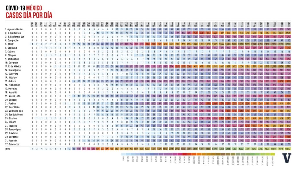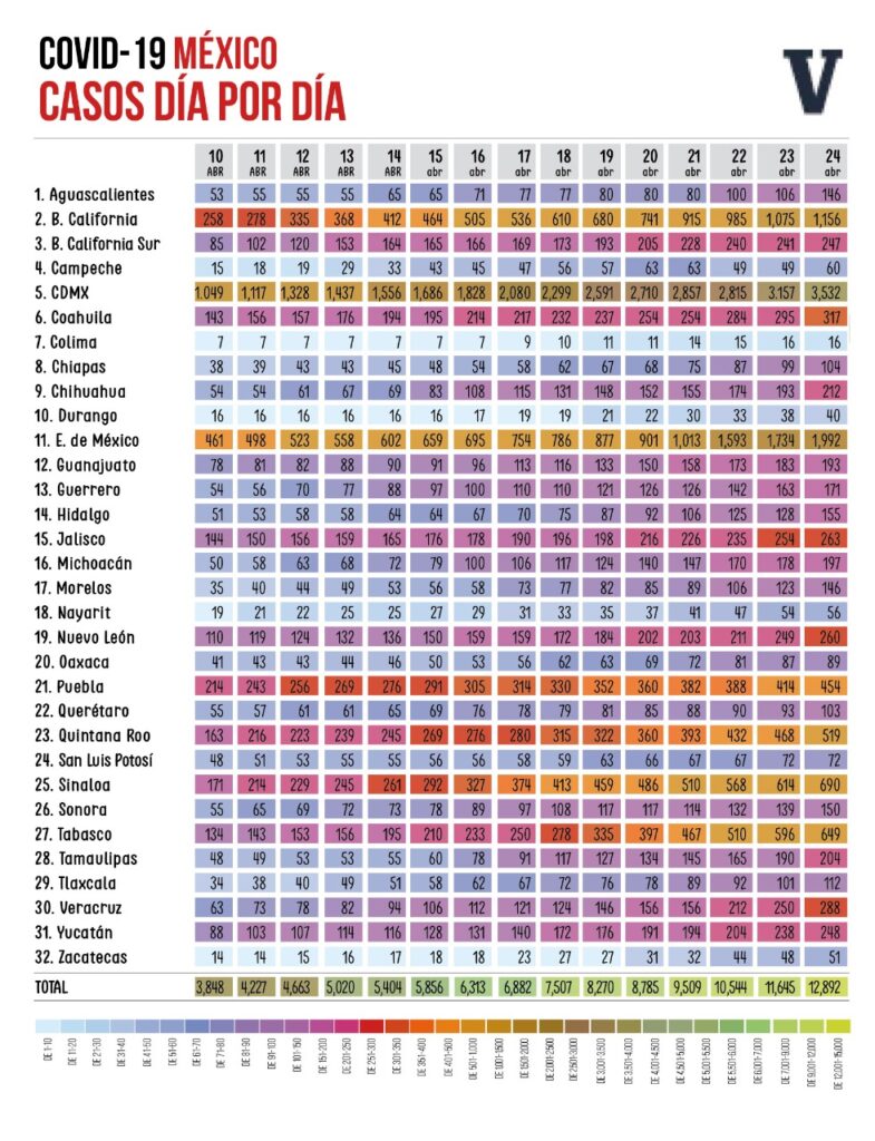 Osiris Olachea / La Voz de Michoacán Ciudad de México. Este viernes México registra 12 mil 872 casos confirmados acumulados de la enfermedad de COVID-19, de los cuales mil 221 han muerto y 4 mil 502 se mantienen con la enfermedad activa, informó el director general de Epidemiología de la Secretaría de Salud (Ssa) federal, José Luis Alomía. Esto representa un aumento de mil 239 contagios nuevos en el último día, así como 152 decesos, de acuerdo con el reporte emitido este día, con corte a las 13:00 horas. Los casos sospechosos acumulados llegaron a 7 mil 889, mientras que los negativos son 41 mil 573, de un total de 62 mil 334 personas estudiadas en todo el país. Fuente: Dirección General de Epidemiología. Diseño: Enrique Santiago y Elizabeth Zavala, La Voz de Michoacán. Por número de casos acumulados, es decir desde que comenzó el registro de pacientes con el virus de SARS-CoV-2 en México, las entidades que reportan más casos son: Ciudad de México (3,532)Estado de México (1,992)Baja California (1,156)Sinaloa (690)Tabasco (649)Quintana Roo (519) Siguen los estados de Puebla (454), Coahuila (317), Veracruz (288), Jalisco (263) y Nuevo León (260), con más casos acumulados. Por casos activos, es decir, los que manifestaron inicio de síntomas en las últimas 2 semanas, las entidades que tienen más personas con la enfermedad de COVID-19 aún presente son: Ciudad de México (1,378)Estado de México (764)Tabasco (276)Baja California (259)Sinaloa (244)Quintana Roo (146) La tasa de incidencia de casos activos en el país es de 3.52 por cada 100 mil habitantes. Las entidades con mayor tasa son: Ciudad de México (15.28)Tabasco (10.73)Quintana Roo (8.47)Sinaloa (7.73)Baja California (7.13)Aguascalientes (4.53) Defunciones De las mil 221 personas que han fallecido en México a causa de la enfermedad del COVID-19, la mayoría han ocurrido desde el 14 de abril a la fecha, además de que se reportan 77 muertes sospechosas de coronavirus, es decir, que aún no se determina el estado serológico del paciente que falleció y están en espera de resultados a la prueba del SARS-CoV-2, por lo que parte de estos casos podría sumarse al número total de muertes. Los estados que registran más fallecimientos son la Ciudad de México, Baja California, Estado de México, Sinaloa, Tabasco, Quintana Roo, Puebla y Chihuahua. También se tienen confirmados mil 934 casos de COVID-19 en personal de la salud. De ellos, 47 por ciento son médicos, 35 por ciento enfermeros, 15 por ciento otros profesionales sanitarios, uno por ciento laboratoristas y uno por ciento dentistas. Casos día por día Fuente: Dirección General de Epidemiología. Diseño: Enrique Santiago, La Voz de Michoacán. Fuente: Dirección General de Epidemiología. Diseño: Enrique Santiago, La Voz de Michoacán.