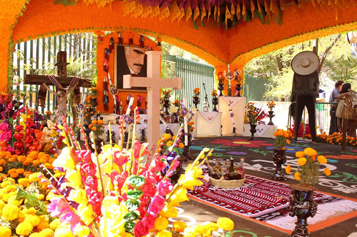 Jalisco. En el Rancho Los Tres Potrillos, sobre la tumba de Vicente Fernández, artesanos michoacanos vistieron el altar monumental en honor al grande de la música ranchera para su primera celebración de Noche de Muertos y en el marco de su primer Aniversario Luctuoso.