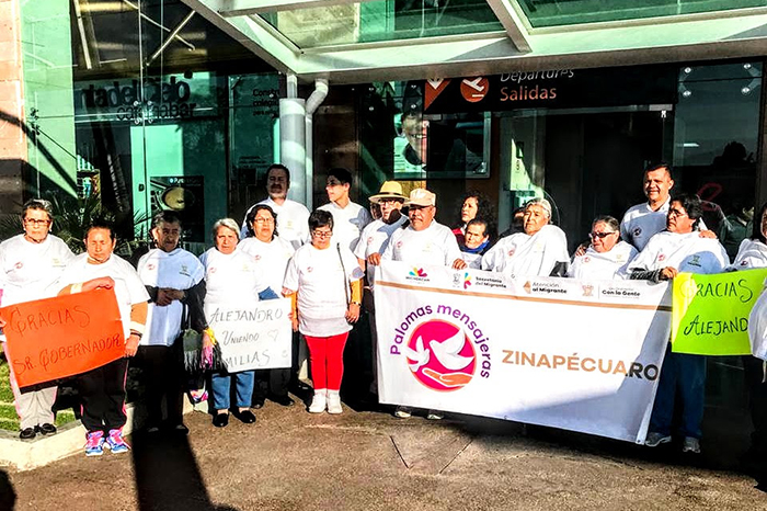 Redacción/La Voz de Michoacán Morelia, Michoacán. A 25 meses de que inició en Zinapécuaro el Programa de Palomas Mensajeras, 136 adultos y adultas mayores de este municipio han viajado a Estados Unidos a reencontrarse con sus seres queridos. Durante las últimas horas, 23 madres y padres de familia provenientes de comunidades de esta municipalidad, se reencontraron con sus hijas e hijos en Illinois; ellos integran el quinto grupo de Palomas Mensajeras de Zinapécuaro que han viajado al vecino país del norte. El trabajo coordinado del Gobierno del Estado, a través de la Secretaría del Migrante, encabezada por José Luis Gutiérrez Pérez; con autoridades municipales y migrantes organizados en el Club Francisco Villa, permitió que los integrantes de este grupo partieran del aeropuerto de Morelia a la ciudad de Chicago. En las instalaciones de la Casa Michoacán, madres y padres de familia se reencontraron con sus hijas, hijos y familias conformadas por ellos en Estados Unidos. Zinapécuaro fue el primero de los 82 municipios que en estos dos años se han sumado al programa de reunificación familiar, el cual, hasta el momento, ha permitido la autorización de visas para cinco mil 810 personas, conformadas en 258 grupos.