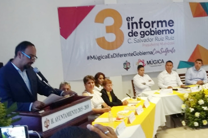 Redacción/ La Voz de Michoacán Múgica, Michoacán. En Múgica se han invertido más de 21 millones de pesos en el sector salud, educativo, infraestructura carretera, social, agropecuario, educativo, y seguridad, agropecuario y pesquero, entre otros. Lo anterior fue externado por Julio Vargas Medina, titular de la Comisión de Pesca Compesca del gobierno del Estado, durante su participación en el Tercer Informe del alcalde Salvador Ruiz Ruiz, quien rindió cuentas a su pueblo de la administración que encabeza ante su pueblo. Dio a conocer que en este gobierno se invirtió 9 millones 197 mil pesos en la construcción de módulos de Economía y Atención contra la Violencia en la Ciudad de la Mujer. También se destinado 6 millones 192 mil pesos para el apoyo alimentario a través del Programa Si Alimenta, para adultos mayores, además de la entrega de desayunos escolares y la asistencia a familias en desamparo De la misma manera, se destinaron 5 millones 943 mil pesos para apoyar el desarrollo de la infraestructura, equipamiento y disposición de equipamiento y maquinaria para productores agrícolas y pecuarios.