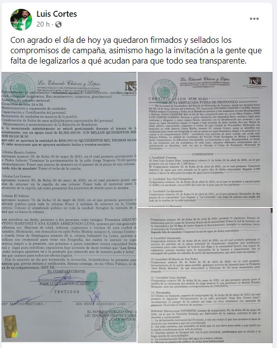 Puruándiro, Michoacán. El candidato a Presidente Municipal de Puruándiro, José Luis Cortés Olmedo, aseguró que sus propuestas y compromisos ya están firmados por Notario Público, las cuales son las siguientes: *Que las obras se harán con gente de Puruándiro sin constructoras foráneas *Se apoyará al sector agrícola, con caminos saca cosecha, semilla e insumos a bajo costo *Poner internet gratis para los estudiantes, indispensable en estos tiempos. * Donar un mes de mi salario a función de los niños con cáncer y asilo de ancianos. *Impulsar el deporte en todos los ámbitos, el turismo así mismo elevar a Puruandiro para hacerlo un pueblo mágico. *Mejorar las carreteras que conllevan a Puruándiro con sus comunidades, así como la gestión para hacer realidad el entronque de puruandiro a la autopista. *Gestionar un terreno para un panteón municipal y uno privado con todos los servicios. * Apoyar a las madres solteras con diversos programas que las beneficien, e impulsar también el programa de jefes de manzana en todo el municipio