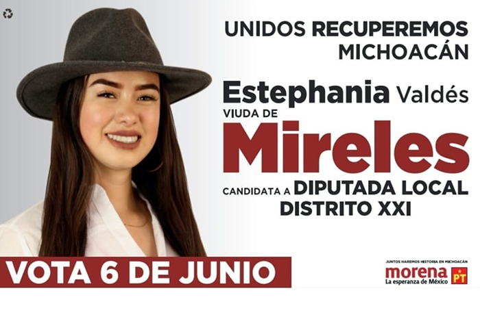 Redacción / La Voz de Michoacán Morelia, Michoacán. Estephania Valdés, esposa del exvocero de los autodefensas José Manuel Mireles Valverde, quien murió el año pasado, se lanzó como candidata a una diputación local por el Distrito XXI, sin embargo, ha sido criticada en redes sociales por promocionarse como “viuda de Mireles”. La joven de 23 años es abanderada de la coalición Morena-PT para ocupar una curul en el Congreso de Michoacán, para lo cual ha realizado actos proselitistas en algunos de los ocho municipios que conforman su distrito: Coalcomán, Aquila, Aguililla, Buenavista, Chinicuila, Peribán, Coahuayana y Tepalcatepec. Portando el icónico sombrero que usó su esposo, Estephania ha realizado recorridos en algunas poblaciones de la región de Tierra Caliente en busca del voto, sin embargo, ha llamado la atención que en la propaganda que utiliza, el apellido de Mireles aparece con una tipografía incluso más grande que la de su propio nombre. Estephania se casó con el doctor Mireles en 2019, cuando ella tenía 21 años de edad y él 60, y enviudó en noviembre de 2020, cuando Manuel Mireles Valverde, fundador de las autodefensas y subdelegado médico del ISSSTE, murió por complicaciones derivadas de COVID-19. “Como luchadora social, he trabajado para defender los derechos y valores que nos distinguen a los michoacanos. Quiero ser diputada local para representarte en el Congreso del Estado”, expuso en su arranque oficial de campaña, que se puede ver en su perfil de Facebook. Estephania promete mejores condiciones de vida para los michoacanos y asegura que lo cumplirá, ya que es una “mujer de palabra”. https://twitter.com/EstephaniaVald4/status/1373479990050881537
