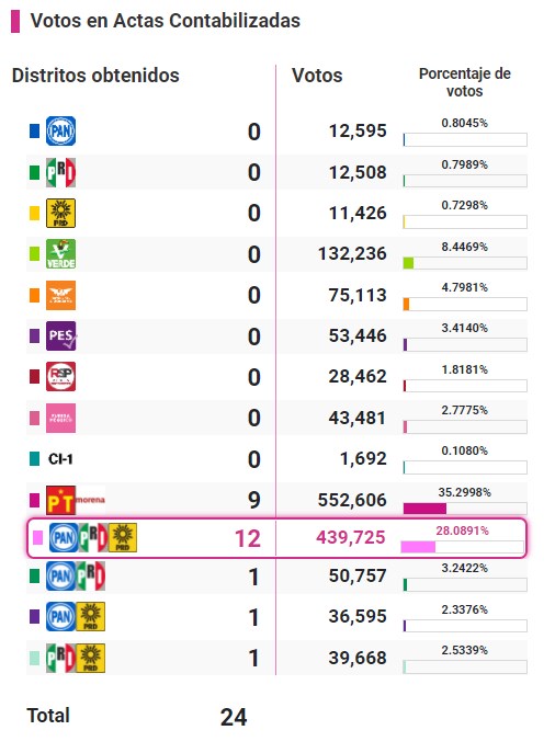 Redacción / La Voz de Michoacán Morelia, Michoacán. Al cierre del Programa de Resultados Electorales Preliminares (PREP), la alianza PAN-PRI-PRD ganó 12 de los 24 distritos electorales locales en Michoacán, además de otros tres distritos obtenidos por estos mismos institutos políticos en otras coaliciones, por lo que en total tendrán 15 diputaciones de mayoría relativa. A las 20:00 horas de este lunes 7 de junio el PREP finalizó el conteo y capturó 6 mil 113 de 6 mil 214 actas, es decir, 98.3746 por ciento del total. Los distritos que ganó la alianza PAN-PRI-PRD son: Coalcomán, Apatzingán, Los Reyes, Jiquilpan, Puruándiro, Tacámbaro, Pátzcuaro, Morelia Noroeste, Morelia Sureste, Zitácuaro, Maravatío y Zamora. Mientras que el PAN-PRI ganaron Morelia Noreste; PAN-PRD ganó La Piedad y PRI-PRD ganó en Zacapu. La alianza PT-Morena venció en los distritos Lázaro Cárdenas, Múgica, Uruapan Sur, Uruapan Norte, Paracho, Morelia Suroeste, Huetamo, Hidalgo y Tarímbaro. ::: CONSULTA AQUÍ LOS RESULTADOS EN LOS DISTRITOS LOCALES ::: Votos en Actas Contabilizadas Al cierre del PREP, este 7 de junio a las 20:00 horas