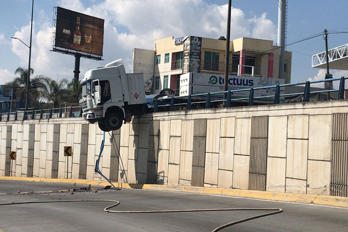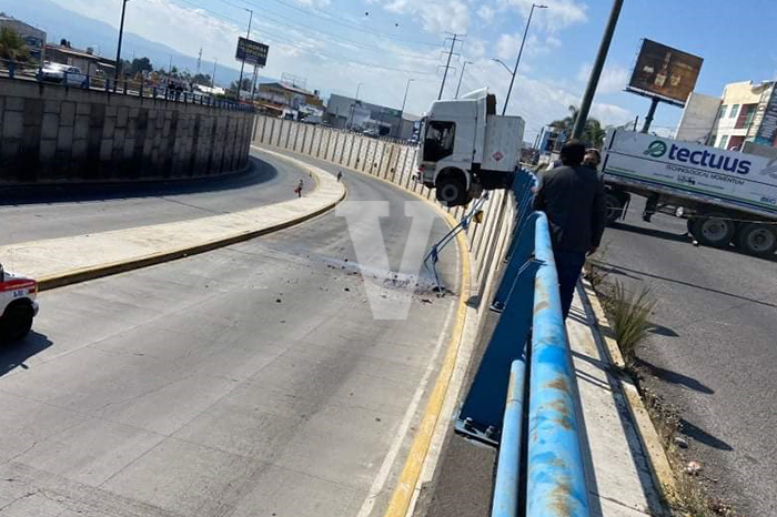 Redacción / La Voz de Michoacán Morelia, Michoacán. Un vehículo que transportaba gas natural chocó contra un barandal metálico de contención y estuvo a punto de caer desde una altura considerable hacia los carriles centrales del Periférico Paseo de la República, al poniente de Morelia. El accidente dejó un lesionado, informaron las autoridades policiales y de rescate. Lo anterior sucedió la mañana de este martes en una de las laterales de la mencionada vialidad, frente a la colonia La Quemada y en las cercanías del crucero salida a Quiroga. La unidad es de la marca Shacman F3000, color blanco, con rótulos de "KNGULTRA" y "Tectuus", y había realizado unas maniobras en una estación de gas "GNU gas neutral", entonces algo ocurrió, el vehículo se estrelló contra la comentada barrera de contención y el chofer saltó. El conductor terminó malherido y fue ayudado por unos paramédicos, quienes lo canalizaron a un hospital para su adecuada atención médica, de él solo se supo que tiene entre 43 y 45 años de edad y está delicado de salud. Foto: Especial Los elementos de Bomberos Morelia se enteraron del incidente, pues además hubo fuga de gas, e inmediatamente arribaron a la escena para controlarla y se encargaron de lo conducente. Asimismo, oficiales de Tránsito abanderaron el percance y pidieron el apoyo de una grúa, cuyos operadores engancharon el camión afectado para evitar que la cabina colapsara y al final lo retiraron. Del peritaje respectivo se encargó la instancia competente. Foto: La Voz de Michoacán.