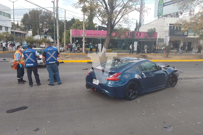 Redacción / La Voz de Michoacán Morelia, Michoacán. Esta tarde, un fuerte choque dejó como saldo el fallecimiento de una persona y el que otras 2 resultaran lesionadas. El impacto se debió a que sobre la avenida Camelinas, esquina con Ignacio Chávez, de esta ciudad, a la altura del bar Pecatto, un lujoso auto de la marca Nissan se impactó contra un Tsuru. Versiones preliminares indican que el coche deportivo, de color azul, se habría saltado la luz roja del semáforo, impactando por el costado al Tsuru, de color gris, con placas del Estado de México, el cual justo salía de la avenida Ignacio Chávez. Los 2 lesionados viajaban a bordo del coche azul, en tanto que el fallecido viajaba en el Tsuru, pero debido al impacto su cuerpo quedó tendido sobre el carril central, junto al camellón que lo separa del lateral. Debido a esto y a que varios objetos salieron disparados del Tsuru, la circulación en los carriles centrales y en el lateral en el sentido de Las Américas al IMSS fue cerrada, ocasionando un severo congestionamiento vial.