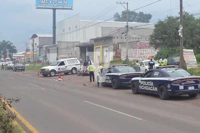 Redacción / La Voz de Michoacán Morelia, Michoacán. Un motociclista perdió la vida en un choque en la salida a Charo de la Ciudad de Morelia en la colonia Vicente Lombardo Toledano, hecho que ya investiga el personal de la Fiscalía General del Estado (FGE). De acuerdo con datos obtenidos por este medio el incidente ocurrió en las inmediaciones de las instalaciones del Centro de Estudios Tecnológicos e Industriales (Cetis) y enfrente de un taller de detallado y hojalateado. La víctima es un hombre identificado como Ricardo C. T. de 25 años de edad quien viajaba de poniente a oriente a bordo de una motocicleta negra con vivos rojos, tipo deportivo. Los datos preliminares señalan que fue golpeado por una camioneta Nissan, pick up, de color azul sin placas, que salió del taller que se mencionó previamente. El joven salió proyectado de su unidad a 25 metros de donde fue el impactó y murió a un costado de la cinta asfáltica. La unidad fue guardada por unos civiles de manera momentánea en el talle, sin embargo posteriormente se sacó para ponerlo a disposición del personal de la Fiscalía General del Estado que acudió a realizar el peritaje correspondiente y el levantamiento del cadáver, en tanto personal de la Policía Michoacán se encargó de desviar al tránsito para evitar otro accidente y permitir las labores de investigación. Al momento se ignora si la camioneta estaba tripulada al momento del accidente o si salió de la cochera del taller y al estar en una pendiente descendió por ella hasta terminar en la carretera, solo se observó que cuando la sacaron para que los peritos la revisaran le pusieron polines en las llantas para detenerla.