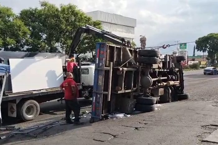El percance se registró a la altura de la colonia Tiníjaro, donde un camión que transportaba placas de cuarzo volcó al ganarle el peso en el paso a desnivel