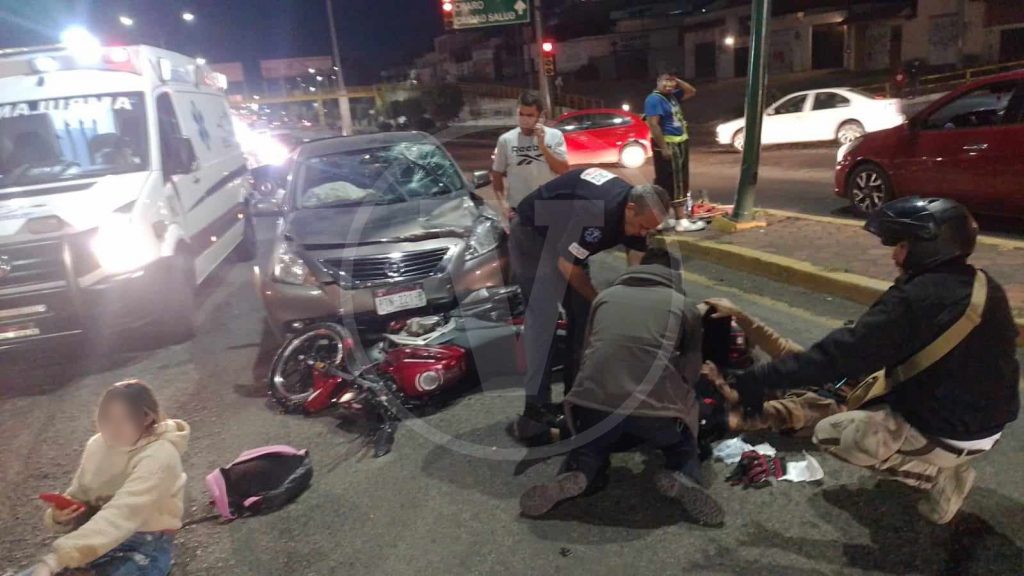 Redacción / La Voz de Michoacán Morelia, Mich.- Un joven y su prima resultaron lesionados cuando su motocicleta fue impactada por un automóvil sobre la avenida Madero Oriente de la ciudad de Morelia, indicaron autoridades policiales. El aparatoso accidente se registró la noche de este martes a la altura de la colonia Unión Ejidal Isaac Arriaga, en la salida a Charo, frente a la esquina Lituania y Zafrilla. El incidente fue reportado al número de emergencias e inmediatamente acudieron unos paramédicos, quienes auxiliaron a los susodichos y los canalizaron a un hospital para su adecuada atención médica, pacientes que responden a los nombres de Elizabeth y Luis Ángel, de 18 y 20 años edad respectivamente. Se apreció que la moto de los ahora heridos es una 250, color rojo. El otro vehículo involucrado es un Nissan Versa, color gris, con placa PTN221B. Foto: La Voz de Michoacán. Unos patrulleros de Tránsito se encargaron del peritaje correspondiente para deslindar responsabilidades, luego pidieron el apoyo de una grúa, la cual retiró las referidas unidades y las llevó un corralón.
