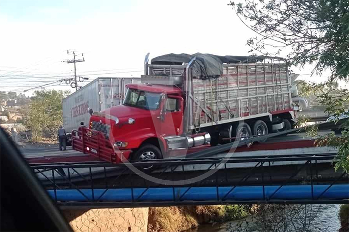 Redacción / La Voz de Michoacán Morelia, Michoacán. Un camión torton estuvo a punto de caer de un puente del Periférico Paseo de la República hacia el Río Grande, esto durante un accidente en el que al parecer estuvo involucrado un tractocamión. El percance sucedió la mañana de este martes cerca de las colonias Diego Rivera y Lomas de Santiaguito, en la zona nororiente de Morelia. El hecho, además de daños materiales, también ocasionó congestión automovilística en el sitio. Unas personas reportaron la situación fue reportada al número de emergencias 911. En el lugar se presentaron patrulleros de vialidad, mismos que abanderaron el incidente y pidieron una grúa para enganchar el pesado vehículo y evitar su caída. Los uniformados ae encargaron del peritaje correspondiente para deslindar responsabilidades.
