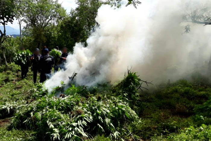 Elementos adscritos a la Secretaría de Seguridad Pública (SSP), realizaban un recorrido sobre el cerro conocido como La Sierra del Sol, cuando localizaron cuatro cultivos ilegales, de 400 metros cuadrados cada uno, con tres mil 780 plantas, las cuales fueron aseguradas e incineradas en el sitio.