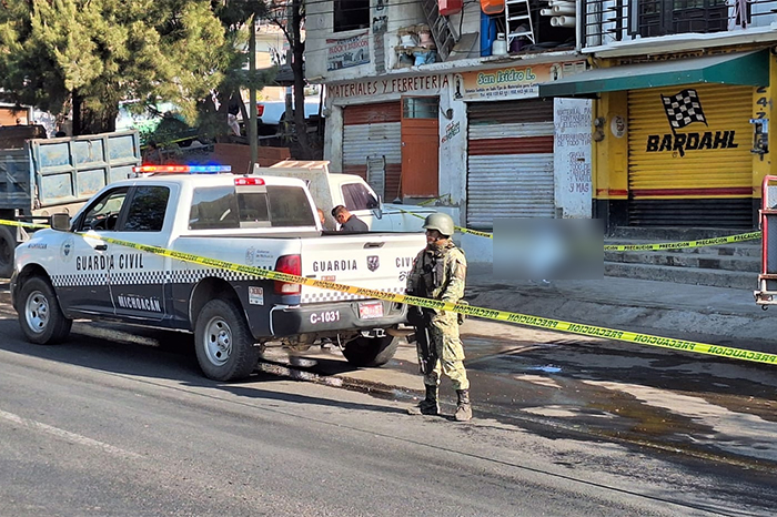 Redacción / La Voz de Michoacán Uruapan, Michoacán. Un hombre fue asesinado a balazos por fuera de una tienda de materiales de su propiedad, en la calzada Benito Juarez, de la colonia Mártires de Uruapan. Fue la mañana de este viernes, cuando la víctima, se disponía a abrir su local ubicado entre las calles Prolongación Revolución y Jesús Díaz, y en determinado momento fue agredida por pistoleros que al parecer ya la esperaban. Luego de perpetrar la agresión, los pistoleros huyeron en un vehículo, mientras que vecinos reportaron lo sucedido al servicio de emergencia y al lugar acudieron paramedicos de Protección Civil Municipal, pero el hombre ya había fallecido. La zona fue acordonada y se solicitó la intervención del personal de la Fiscalía Regional para las actuaciones correspondientes; la identidad del ahora occiso no fue revelada sólo mencionó que era dueño de la tienda de materiales donde fue ultimado.