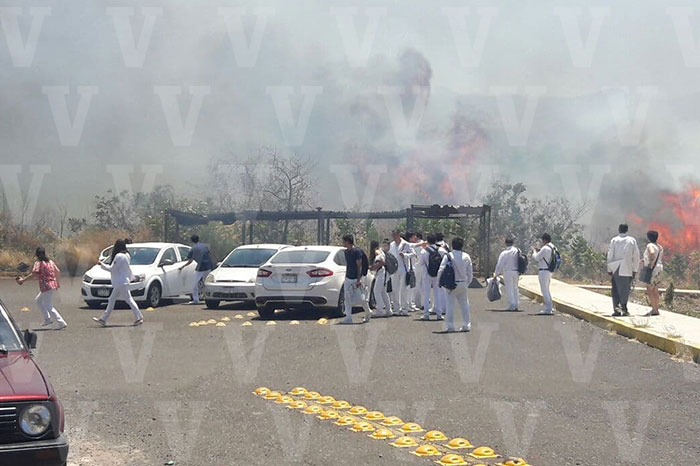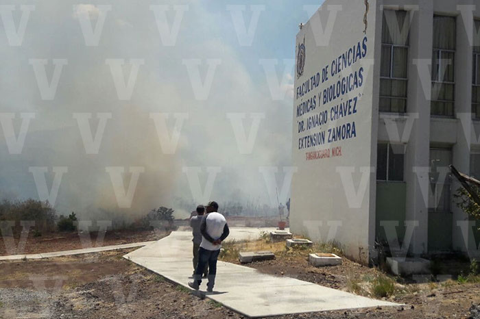 Redacción/La Voz de Michoacán Tangancícuaro, Michoacán. Decenas de estudiantes de la Facultad de Medicina, extensión de la Universidad Michoacana de San Nicolás de Hidalgo, fueron desalojados de manera preventiva, luego de que un incendio de pastizal llegará hasta las cercanías de sus instalaciones. Fue la tarde de este jueves, cuando varios automovilistas alertaron al personal de Bomberos Municipales sobre una quemazón en las inmediaciones de la escuela de medicina, enseguida los propios estudiantes y profesores solicitaban el apoyo de los bomberos. Fue una motobomba y un pequeño camión con dos bomberos cada uno, los que una primera instancia arribaron hasta el sitio de la emergencia para combatir las llamas y evitar daños al recinto educativo. Sin embargo los esfuerzos de los vulcanos eran insuficientes ya que el fuego se extendió por más de dos kilómetros a la orilla de la carrera, por lo que una brigada de la Unidad de Protección Civil Municipal de la ciudad de Zamora se trasladó al lugar con equipo y camiones para controlar el fuego y evitar que se extendiera a otras partes y con ello causará daños a empresas y propiedades que existen por la zona.