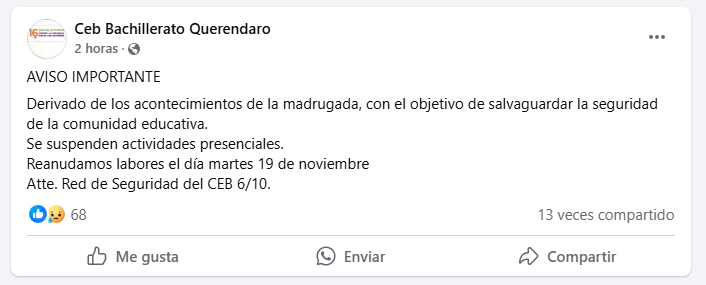 Redacción / La Voz de Michoacán Morelia, Michoacán. Los municipios de Queréndaro y Zinapécuaro padecieron una madrugada violenta, generada por células de la delincuencia organizada, con saldo preliminar de un fallecido, otra persona herida y las dos presidencias municipales baleadas. Respecto a Queréndaro, trascendió que elementos de la Policía municipal repelieron una agresión armada; sin embargo, uno de los oficiales perdió la vida, además de que una mujer policía resultó lesionada. Derivado de los acontecimientos, el Centro de Estudios de Bachillerato “Dr. Ignacio Chávez” de Queréndaro suspendió las clases presenciales a fin de resguardar la seguridad de la comunidad educativa, anunciando que se reanudan labores hasta el martes 19 de noviembre. Por su parte, en Zinapécuaro, delincuentes armados generaron hechos de violencia, como la quema de una camioneta de transporte público, así como la fachada de la presidencia municipal fue baleada con armas de alto poder. Por estos, en este último municipio, el gobierno determinó la cancelación de la Expo Fiesta y la carrera atlética. Además, a través de un comunicado, el gobierno local hizo un llamado enérgico al Gobierno de México, encabezado por Claudia Sheinbaum Pardo, y al estatal, de Alfredo Ramírez Bedolla, para que “pongan en marcha una estrategia en conjunto que garantice seguridad para cada ciudadana y ciudadano”, manifestando que están en toda la disposición de sumarse a dicha estrategia. Pobladores también refirieron que eran varios vehículos en los que se desplazaban los miembros del crimen organizado, incluso a bordo de los llamados “monstruos”, con blindaje artesanal. En ambos lugares ya se encuentran fuerzas del orden federales, estatales y municipales, resguardando las zonas de conflicto.