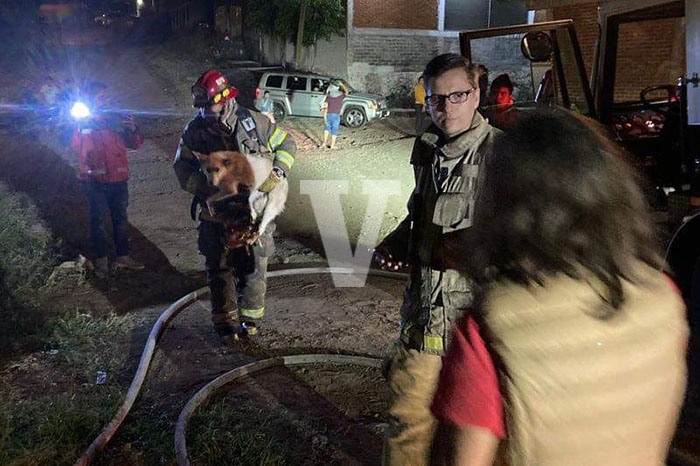 Redacción / La Voz de Michoacán Uruapan, Michoacán. Un grupo de niños que jugaban con pirotecnia provocaron accidentalmente el incendio de un domicilio construido de madera, miso que dejó cuantiosos daños materiales, en la colonia San Juan Evangelista de la ciudad de Uruapan. El incendio se registró durante la noche del pasado sábado, y fue reportado en una primera instancia por vecinos de la calle José Ángel, lo que movilizó a los bomberos Profesionales de Uruapan. Foto: La Voz de Michoacán. En cuestión de minutos arribaron las unidades BP-01 y BP-03, cuyos rescatistas encontraron el domicilio en llamas y procedieron a combatir el fuego, para evitar que se propagaran a otras viviendas aledañas. Durante las labores de auxilio los vulcanos rescataron a dos perros adultos y cuatro cachorros que habían quedado atrapados en las llamas, los cuales fueron entregados a sus dueños sanos y salvos. Foto: La Voz de Michoacán. Sobre el caso, algunos habitantes de la zona comentaron a los bomberos que los fuegos pirotécnicos que eran detonados en la calle, y aparentemente uno de ellos cayó dentro de la casa, comenzando así el siniestro. Una vez controlada la quemazón, los bomberos realizaron labores de remoción de escombros y enfriamiento para evitar que las llamas se reavivaran, sin que se reportaran personas lesionadas. Foto: La Voz de Michoacán.