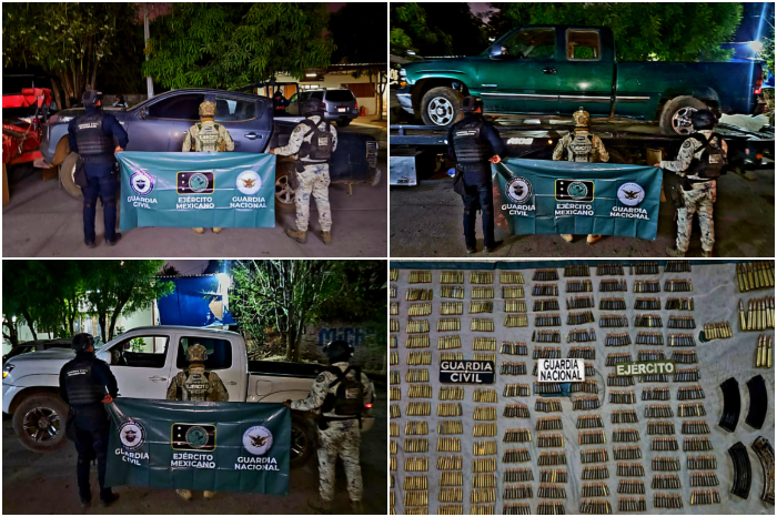 Redacción / La Voz de Michoacán Apatzingán, Michoacán. Derivado de los operativos permanentes que se mantienen de forma coordinada entre los tres niveles de Gobierno en la Tierra Caliente de Michoacán, durante las últimas horas fueron aseguradas tres camionetas con reporte de robo, cargadores y cartuchos útiles. Oficiales del Ejército Mexicano, Guardia Civil y Guardia Nacional realizaban patrullajes en la localidad de “El Molinito”, perteneciente al municipio de Apatzingán, de ubicaron las unidades motrices en aparente abandono. Al revisar, los uniformados confirmaron que se trataba de una Mitsubishi L200, de color gris sin matrícula, con impactos de bala; una Chevrolet Silverado de color verde, con placas NP5490C y una Toyota Tacoma de color blanco, con matrícula MX1994C. Además, en el área los oficiales aseguraron 1,482 cartuchos útiles de diversos calibres y 8 cargadores para arma larga, todo ello junto con las camionetas incautadas fue puesto a disposición de las autoridades competentes.