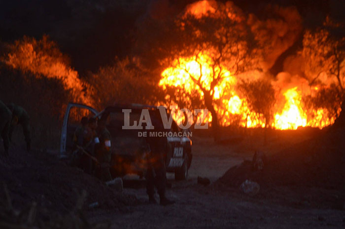 Redacción/La Voz de Michoacán Morelia, Michoacán. Este domingo se reportó una explosión de un ducto de Pemex en San Agustín del Maíz, en las cercanías de la carretera Copándaro-Morelia, a la altura del balneario Agua Azul, el cual ya fue controlado. Autoridades de los tres niveles de gobierno trabajaron en la zona. El área fue asegurada por los elementos de la Gendarmería, de Seguridad Física de Pemex, del Ejército Mexicano y de la Policía Michoacán. Al lugar llegaron personas especializadas para tratar de controlar el incendio. Hasta el momento no de reportan lesionados por la explosión que se habría producido por la presunta ordeña de gasolina. Personal de Protección Civil recomienda a los habitantes de San Agustín del Maíz, mantenerse alejados del lugar.