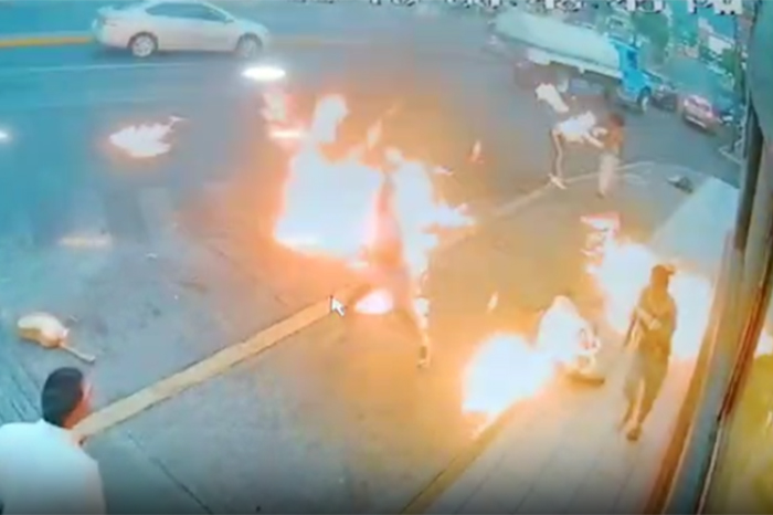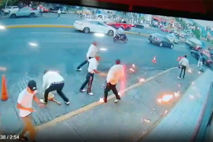Redacción / La Voz de Michoacán Morelia, Michoacán. Circula el video sobre la riña que se suscitó la tarde de ayer domingo sobre la avenida Enrique Ramírez, de Morelia, en la que se vieron involucrados mariachis y un hombre que se dedica a lanzar fuego en el crucero. Los primeros reportes indicaron que se trató de una pelea entre un malabarista y el “tragafuegos”, este último habría sido herido con un arma blanca. Pero en el material videográfico que ha sido difundido, se observa que el sujeto “lanza llamas” es perseguido por un mariachi y le da alcance afuera de una taquería; posteriormente se unen más músicos y algunos golpean al hombre de pelo largo y de playera azul. En momento se separan, pero continúa la discusión, hasta que el sujeto que estaba en aparente desventaja empieza a rociarles gasolina y luego les lanza fuego, alcanzando a algunos de los presentes, sin que pasara a mayores.