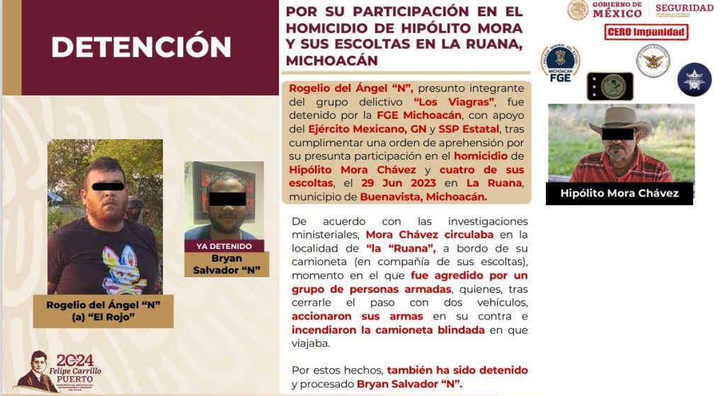 Redacción / La Voz de Michoacán Morelia, Michoacán. La Fiscalía General del Estado de Michoacán (FGE) obtuvo vinculación a proceso y prisión preventiva oficiosa en contra de Rogelio del Ángel “N”, "El Rojo", presunto responsable del homicidio del exlíder de autodefensas, Hipólito Mora Chávez y de sus cuatro escoltas, ocurrido en la tenencia de Felipe Carrillo Puerto, La Ruana, municipio de Buenavista. De acuerdo a la Carpeta de Investigación, el 29 de junio de 2023, un grupo armado perpetró una agresión en contra del exlíder de autodefensas, quien murió en el lugar, así como sus escoltas: Saulo Gamaliel A., Roberto N., Manuel G., y Calixto A. Derivado de las tareas de investigación, se obtuvieron datos de prueba que relacionan a Bryan “N” y Rogelio del Ángel “N” "El Rojo" en los hechos, por lo que, en su momento, se solicitó la respectiva orden de aprehensión. Bryan “N” fue detenido el pasado mes de diciembre y ya se encuentra vinculado a proceso, en tanto que Rogelio del Ángel “N” fue detenido durante una acción interinstitucional en la que también participó personal de la Secretaría de la Defensa Nacional (SEDENA), Guardia Nacional (GN) y Guardia Civil (GC). Rogelio del Ángel “N” fue puesto a disposición del órgano jurisdiccional que lo vinculó a proceso, le fijó prisión preventiva oficiosa y estableció un plazo de tres meses para el cierre de la investigación complementaria.