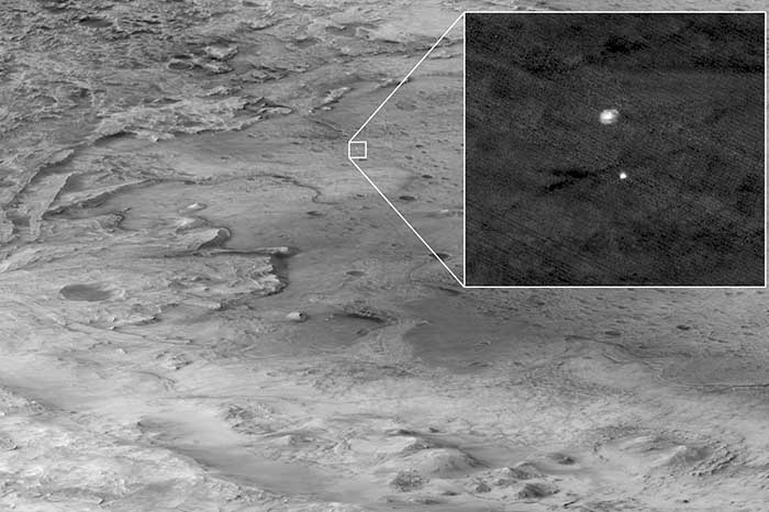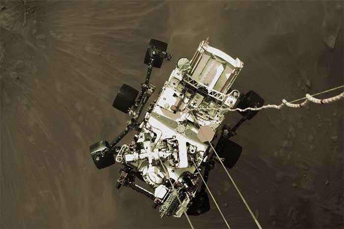 Redacción / La Voz de Michoacán Estados Unidos. Luego de su aterrizaje en Marte, el pasado 18 de febrero, la NASA dio a conocer imágenes de Perseverance, que tiene como un objetivo clave la astrobiología y la búsqueda de signos de vida microbiana antigua. “El rover caracterizará la geología del planeta y el clima pasado, allanará el camino para la exploración humana del Planeta Rojo y será la primera misión en recolectar y almacenar rocas y regolitos marcianos (rocas y polvo rotos)”, expone la NASA. A continuación, cuatro imágenes del rover en Marte: En esta imagen de alta resolución compartida por la NASA se muestra una de las seis ruedas a bordo del rover Perseverance Mars; fue tomada por una de las cámaras de peligro a color de Perseverance (Hazcams). Esta es la primera fotografía en color de alta resolución que enviada por Hazard Cameras (Hazcams) en la parte inferior del rover Perseverance Mars luego del aterrizaje. También de alta resolución, esta imagen fija es parte de un video tomado por varias cámaras cuando el rover aterrizó en Marte; una cámara a bordo de la etapa de descenso capturó la toma. En esta toma, capturada por la cámara del Experimento de imágenes de alta resolución (HiRISE) a bordo del Mars Reconnaissance Orbiter, se muestra la etapa de descenso del rover Perseverance cayendo a través de la atmósfera marciana con su paracaídas detrás. El antiguo delta del río, que es el objetivo de la misión, se aprecia entrando en el cráter Jezero desde la izquierda.