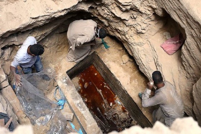 Tras investigaciones se ha dado cuenta de lo que había dentro del sarcófago, destacando tres esqueletos y tres pequeñas piezas de oro con dibujos.