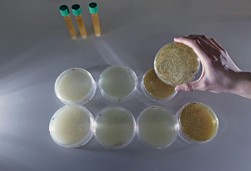 Foto: EFE / Manuel Bruque. Una técnico del laboratorio de microbiología de Biopolis sujeta una placa con una muestra de probióticos.