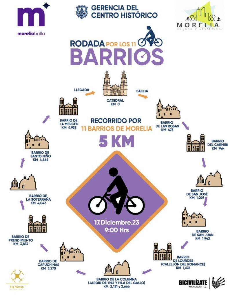 Redacción / La Voz de Michoacán Morelia, Michoacán. Organizan rodada de 5 kilómetros por las calles del Centro Histórico de Morelia, anuncia el presidente municipal, Alfonso Martínez Alcázar. La invitación es para las familias que gusten de las actividades al aire libre, sin importar si tienen o no bicicleta propia. Este domingo 17 de diciembre se realizará esta rodada partiendo desde la Catedral de Morelia, recorriendo 11 barrios del Centro de la ciudad. Iniciará en punto de las 09:00 horas. Los participantes pueden llevar sus propias bicicletas o solicitar una de manera gratuita. El recorrido iniciará en Catedral, pasando por el Conservatorio de las Rosas, el Barrio del Carmen, el Barrio de San José, el Barrio de San Juan, el Callejón del Romance, la Pila del Gallo, la Plaza de Capuchinas, el Barrio de Prendimiento, el Jardín de la Soterraña, el Barrio de Santo Niño, el Barrio de la Merced y, finalmente, regresando a la Catedral. Los 5 kilómetros se recorren usualmente en 30 minutos, si se pedalea a una velocidad moderada de aproximadamente 10 kilómetros por hora. Si se recorre con calma o si se es principiante, pueden recorrerse en 45 minutos.