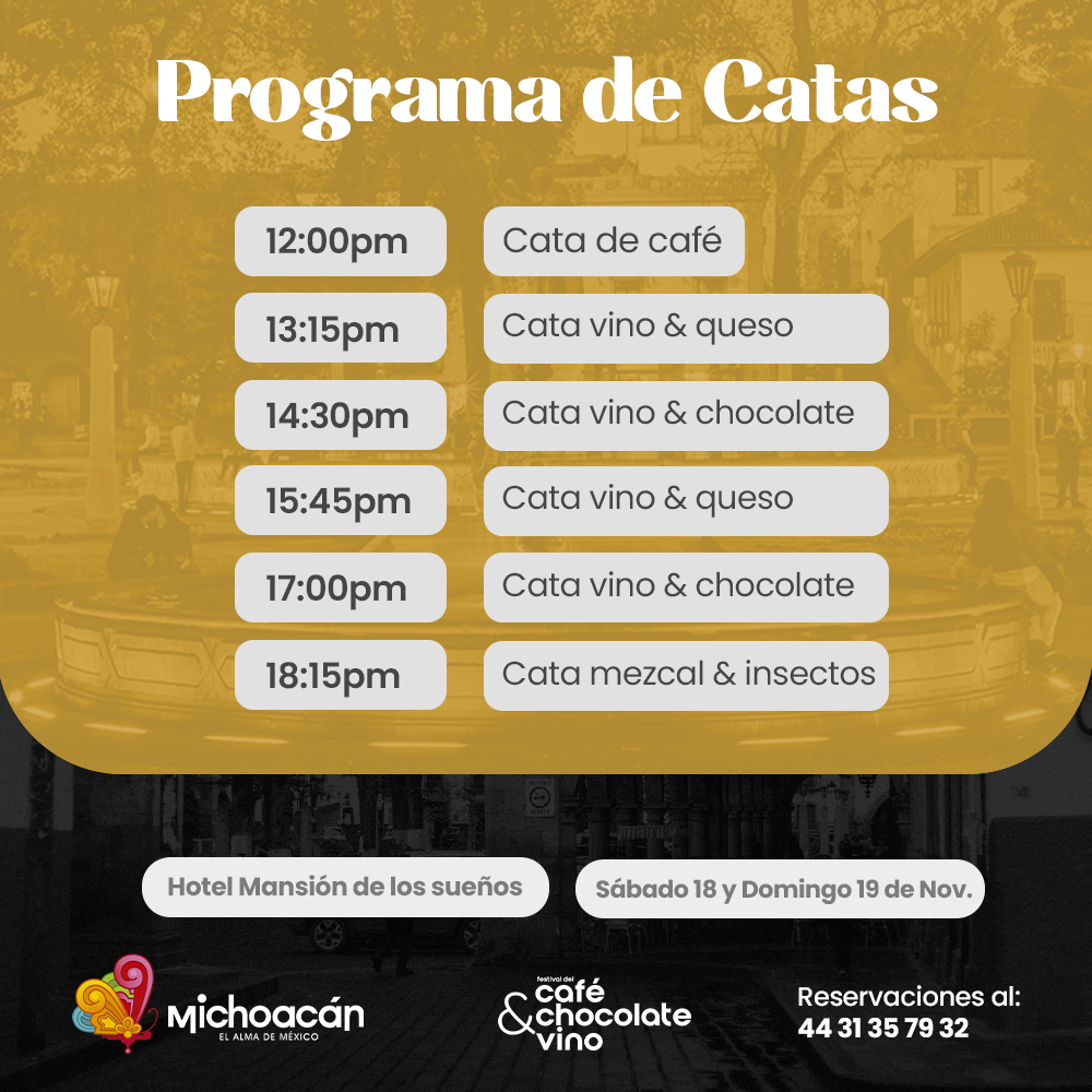 Otras de las catas que estarán disponibles son la del vino y queso en un horario de 13:15 y 15:45 horas, la del vino y chocolate a las 14:30 y 17:00 horas y la del café a las 12:00 horas. Todas estas tendrán un costo de 480 pesos por persona.