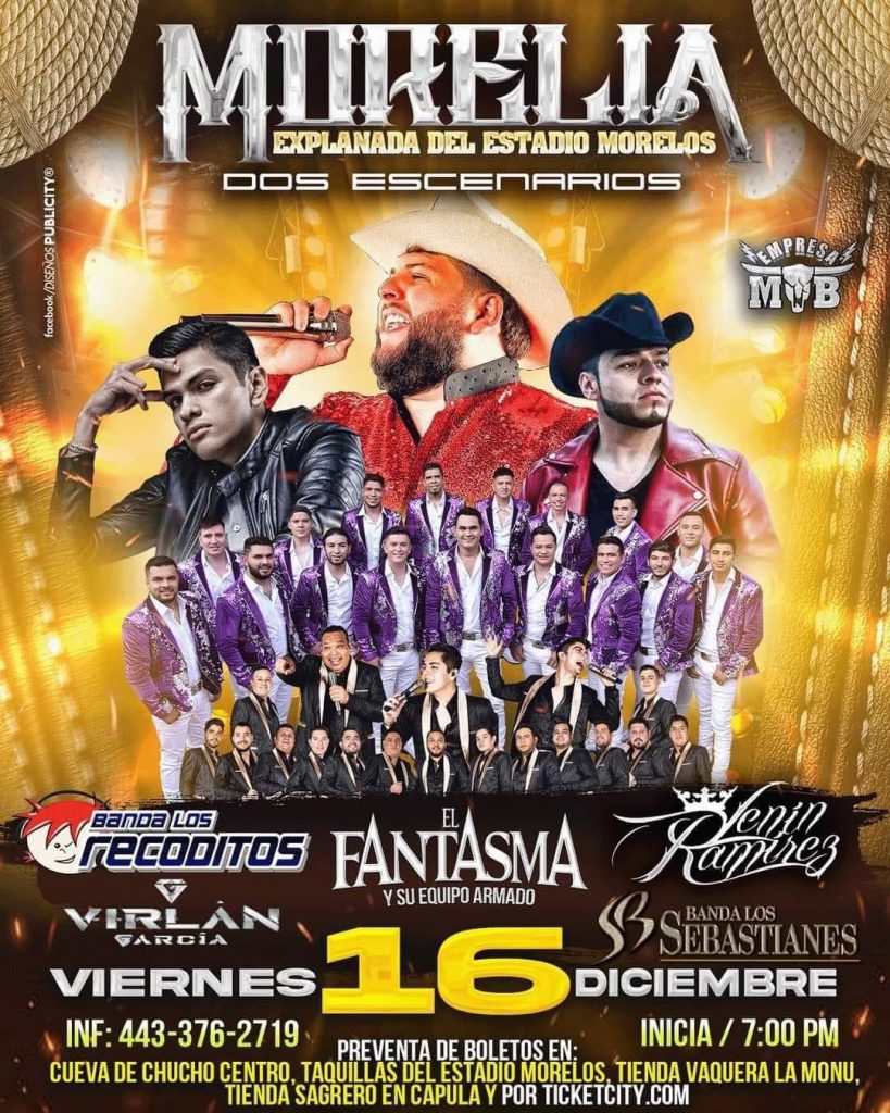 Ya están de regreso los conciertos masivos en Morelia. “El Fantasma”, Banda Los Recoditos, Virlán García, Lenin Ramírez y Banda los Sebastianes tienen pensado convocar a miles de seguidores en la explanada del Estadio Morelos este viernes 16 de diciembre.