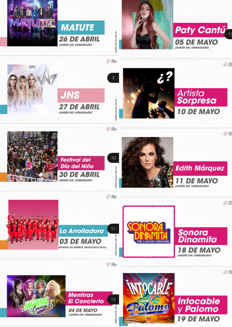 Redacción / La Voz de Michoacán Morelia, Michoacán. Para esta edición del Festival Michoacán de Origen, que será del 26 de abril al 19 de mayo en el Centro de Convenciones de Morelia, se presentarán artistas de talla nacional e internacional. Conoce el programa de los conciertos. Las sedes del evento serán el Jardín del Orquidiario, ubicado en la calzada Ventura Puente, y el Estadio de Béisbol Francisco Villa dentro del complejo deportivo "Ejército de la Revolución" en Olivares de Tzintzuntzan. Viernes 26 de abril Matute en Jardín del Orquidiario Sábado 27 de abril JNS en Jardín del Orquidiario Martes 30 de abril Día del Niño en Jardín del Orquidiario Viernes 3 de mayo La Arrolladora Banda el Limón en Estadio de Béisbol Francisco Villa Sábado 4 de mayo Mentiras El Concierto en Jardín del Orquidiario Domingo 5 de mayo Paty Cantú en Jardín del Orquidiario Domingo 5 de mayo Mar Solís en Jardín del Orquidiario Viernes 10 de mayo presentación de artista sorpresa en Jardín del Orquidiario Sábado 11 de mayo Edith Márquez en Jardín del Orquidiario Sábado 18 de mayo festival de bandas locales y Sonora Dinamita en Jardín del Orquidiario Domingo 19 de mayo Intocable sede pendiente Domingo 19 de mayo Grupo Palomo sede pendiente Foto: Samuel Herrera Jr., La Voz de Michoacán. Así mismo, habrá zona gastronómica, juegos mecánicos y actividades culturales.