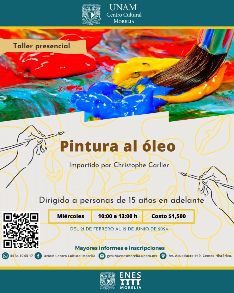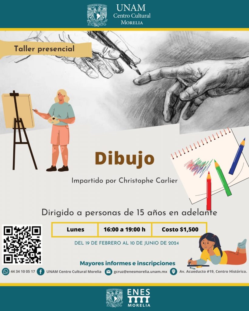 Redacción / La Voz de Michoacán Morelia, Michoacán. Si tienes ganas de aprender alguna de estas disciplinas artísticas, conoce las distinas opciones de clases y de talleres que existen en la capital michoacana programados para los próximos meses. Estos son los horarios y las fechas. Pintura El taller presencial de dibujo será impartido los lunes en un horario de 16:00 a 19:00 horas en el Centro Cultural UNAM Morelia. Así mismo, contarán con un taller de pintura al óleo los miércoles de 10:00 a 13:00, de color y pintura los jueves de 16:00 a 19:00, de pintura con gis pastel los martes de 17:00 a 19:00, de ilustración naturalista con acuarela los lunes de 10:00 a 13:00 y de creación de historietas los lunes y los miércoles de 17:00 a 18:30. Estos serán del 23 de febrero al 14 de junio. Cine Dirigido hacia cineastas, imparten el taller virtual de Diseño de Producción y Dirección de Arte para Cine que se realizará del 6 de febrero al 11 de abril. Serán 8 sesiones los martes y los jueves de 19:00 a 21:00 horas a través de la plataforma Zoom. Así mismo, se realizará virtualmente el taller de Postproducción Audiovisual para aprender técnicas utilizadas en producciones de renombre. Será del 2 al 25 de febrero los domingos en un horario de 10:00 a 14:00 horas. Durará 4 sesiones. Danza Las clases de danza aérea y entrenamiento funcional se imparten los sábados de 11:00 a 13:00 y los martes y los jueves de 17:00 a 18:00. Estas clases resultan una opción ideal para las madres que buscan ejercitarse mientras sus hijos o hijas asisten a danza en otro grupo. La Casa del Arte ofrece clases de tango para todos los niveles los martes, los jueves, los viernes, los sábados y los domingos en dos horarios: de 17:00 a 19:00 y de 19:00 a 21:00. Está ubicada en la calle Vasco de Quiroga número 733 en el Centro Histórico. De igual modo, dan clases de ritmos latinos los lunes, los miércoles y los viernes de 20:00 a 21:00 horas. El Colegio de Morelia ofrece sus talleres de danza tahitiana los martes y los jueves de 18:00 a 20:00, de danza árabe los martes y los jueves de 18:00 a 20:00 y de ritmos latinos los lunes, los miércoles y los viernes de 20:00 a 21:00.