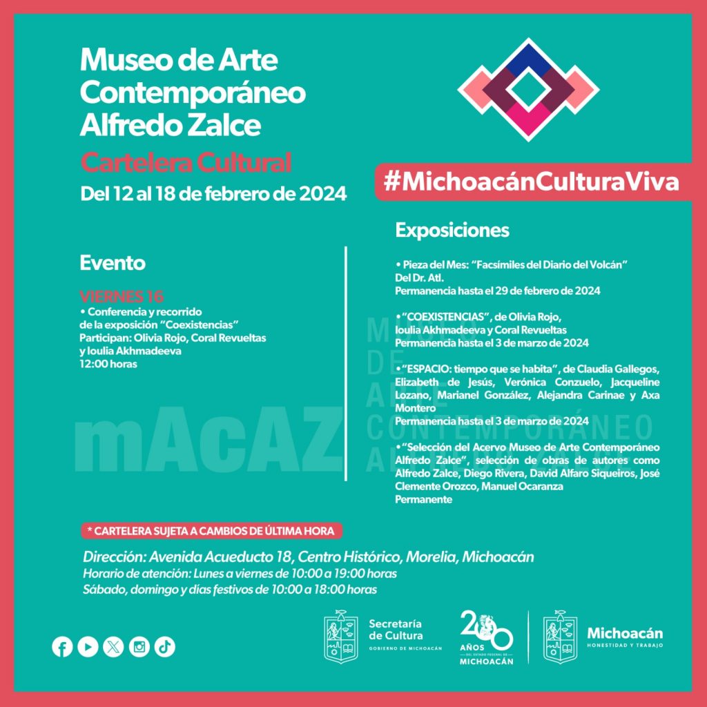 Morelia, Michoacán.- Conoce la cartelera cultural del 12 al 18 de febrero de la Secretaría de Cultura de Michoacán (Secum) y disfruta las tardes de película con la proyección del filme Magallanes, en el Centro Cultural Clavijero, y Clases de historia y Tesoros, en la Casa Natal de Morelos. Convive con las y los artistas en la conferencia y recorrido de la exposición Coexistencias en el Museo de Arte Contemporáneo Alfredo Zalce (Macaz), y la visita guiada por la exposición Poética de la repetición y el desplazamiento, de Coral Revueltas Valle, en el Clavijero. Asiste a las obras Roma al final de la vida en Tingambato, Morelia y Pátzcuaro; y el El perdido de sí mismo en Santiago Undameo, Huiramba y Pátzcuaro. También la puesta en escena de la Rosa de dos aromas se presentará en el teatro Melchor Ocampo, y Palabras para ella, en el Centro Cultural Clavijero. Disfruta del concierto musical de la Rondalla Arpegio en Zamora; y el concierto número 4 de la Orquesta Sinfónica de Michoacán, en el teatro Melchor Ocampo. La obra literaria El Cancionero Michoacano de 1830 a 1940 con canciones, cantos, pirekuas, coplas y corridos, se dará a conocer en el Museo del Estado, y se estrenará el episodio sobre los 200 años de Michoacán en el podcast Identidartes de la Secretaría de Cultura de Michoacán (Secum). Conoce más sobre estos y otros eventos en el siguiente link: https://bit.ly/3whgWuU