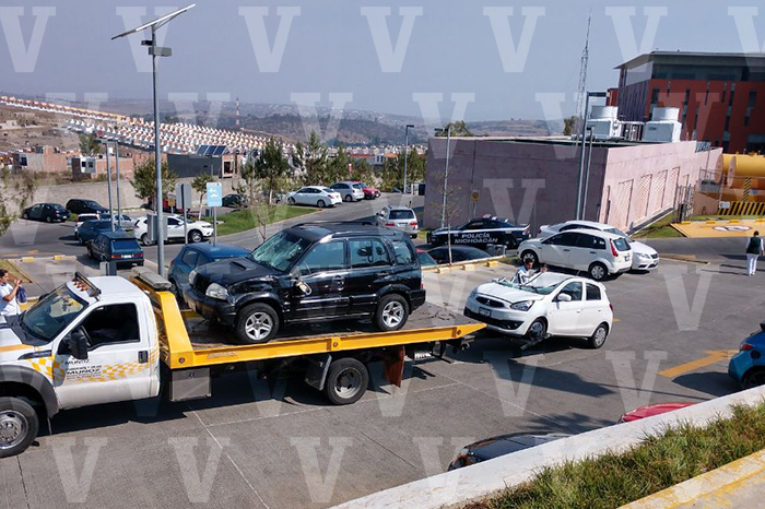 Camioneta cae sobre 2 vehículos en el estacionamiento del IMSS de Charo