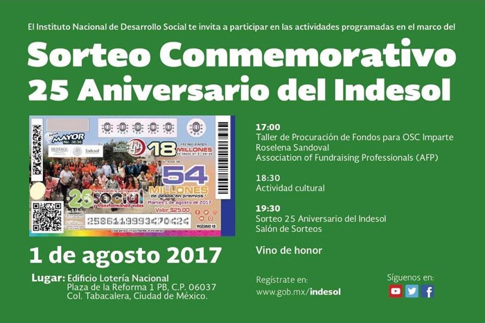 Indesol festejará su 25 aniversario con sorteo de la Lotería Nacional