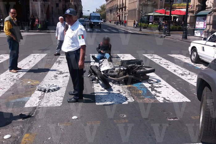 Motociclista queda lesionado, tras choque en el Centro Histórico