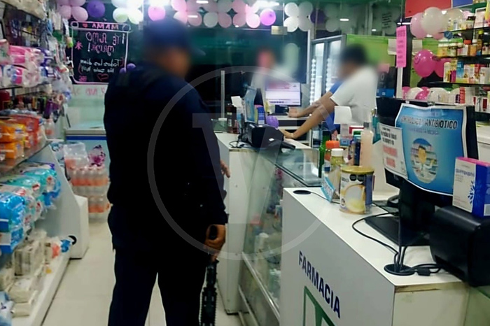 Empistolado amaga con granada a trabajadores de farmacia durante violento robo