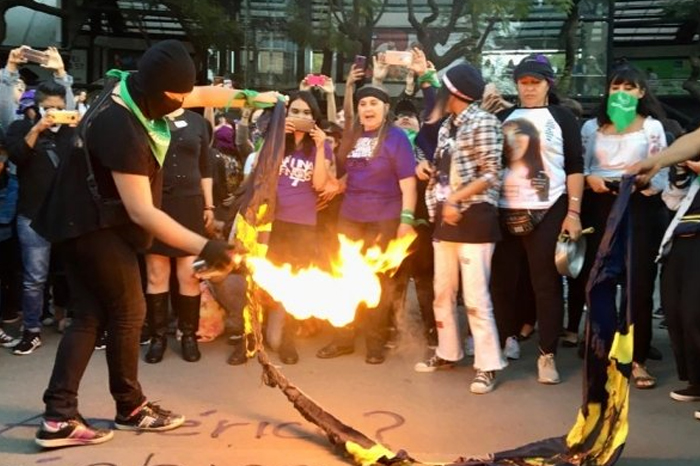Feministas queman bandera del América en la Glorieta de los Insurgentes