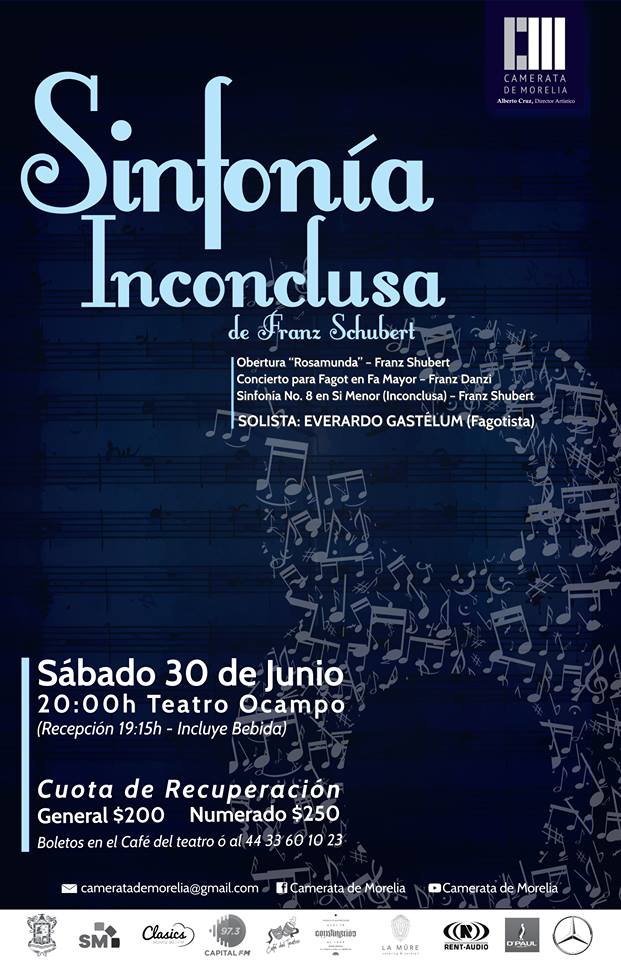 Redacción / La Voz de Michoacán Morelia, Michoacán. La Camerata de Morelia presentará su cuarto concierto dentro del marco de su Primera Temporada de Conciertos. En esta ocasión presentará la “Sinfonía Inconclusa” este próximo sábado 30 de Junio en el Teatro Melchor Ocampo a las 20:00 Horas. La cuota de recuperación del concierto será de 200 pesos por Boleto General y 250 pesos por Boleto Numerado. El concierto llevará como tema “Sinfonía Inconclusa” y se interpretará la obertura "Rosamunda" y la Sinfonía No. 8 en Si Menor ambas de Franz Shubert y el Concierto para Fagot en Fa Mayor de Franz Denzi.