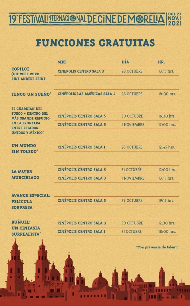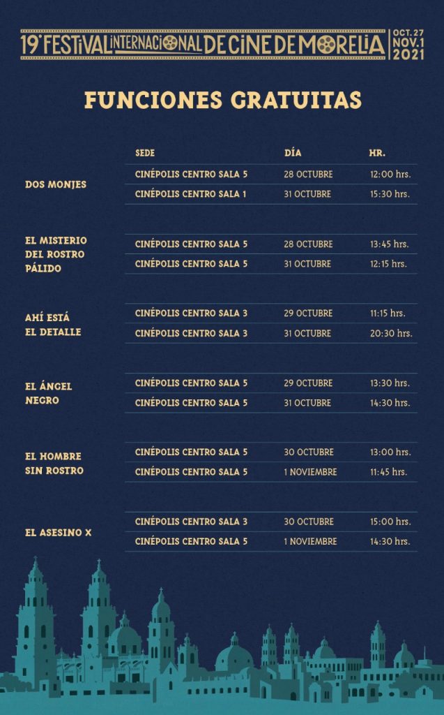 Redacción / La Voz de Michoacán Morelia, Michoacán. El 19° Festival Internacional de Cine de Morelia (FICM) ofrecerá funciones gratuitas en Cinépolis Morelia Centro, Las Américas y a través del Canal 22 para que puedas disfrutar sin costo de algunos títulos que forman parte de la programación. Funciones gratuitas del 19° FICM Dos monjes Sinopsis. En un monasterio del siglo XIX, dos monjes se enfrascan en una pelea. Al ser llamados confesión, cada uno relata una versión diferente de la misma historia, en la que el único elemento común es Ana, la mujer de la cual ambos estuvieron enamorados. Hora y día: jueves 28 de octubre a las 12:00 horas en el Cinépolis Centro sala 5 y domingo 31 de octubre a las 15:30 horas en el Cinéòlis Centro sala 1. El misterio del rostro pálido Sinopsis. Obsesionado con encontrar la cura para una extraña enfermedad, el Dr. Forti experimenta con sus pacientes, quienes van muriendo uno a uno por sus fracasos médicos. Desesperado, se embarca en una expedición a tierras lejanas para estudiar la medicina de los nativos con su hijo Pablo, quien deja entonces a su novia Angélica. Ocho años después, el doctor regresa de su viaje sin su hijo, pero con un extraño acompañante que lleva una pálida máscara. Hora y día: jueves 28 de octubre a las 13:45 horas en el Cinépolis Centro sala 5 y domingo 31 de octubrea las 12:15 horas en el Cinépolis Centro sala 5. Ahí está el detalle Sinopsis. Cantinflas entra en la casa de un poderoso hombre de negocios, en la que trabaja su novia como empleada doméstica, para deshacerse de un perro rabioso. La confusión entre el perro y un mafioso del mismo nombre desencadena una serie de enredos y equívocos hilarantes. Ahí está el detalle fue la primera película en la carrera de Cantinflas en la que tuvo un papel principal y es considerada como una de sus mejores actuaciones. Hora y día: viernes 29 de octubre a las 11:15 horas en el Cinépolis Centro sala 3 y domingo 31 de octubre a las 20:30 horas en el Cinépolis Centro sala 3. El Ángel negro Sinopsis. A pesar de la extraña muerte de las esposas anteriores de Jorge, Elisa decide casarse con él. Al poco tiempo la pareja tiene un hijo. Cristina, la hermana de Jorge, hija del mayordomo y ama de llaves del lugar, llena de envidia, decide separarlos. Para quedarse con el pequeño, engaña a su hermano haciéndole creer que su esposa le es infiel. Cristina cría al bebé como si fuera su hijo, borrándole todo recuerdo de su verdadera madre. Hora y día: sábado 30 de octubre a las 13:00 horas en el Cinépolis Centro sala 5 y lunes 1 de noviembre a las 11:45 horas en el Cinépolis Centro sala 5. El hombre sin rostro Sinopsis. El médico legista Juan Carlos Lozano investiga una serie de asesinatos de mujeres. Después de tener pesadillas sobre un misterioso hombre sin rostro, desea renunciar al caso. Acude a su amigo y psiquiatra Eugenio Britel, quien lo anima a seguir con la investigación y a comenzar un tratamiento para descubrir el motivo de sus sueños. Britel sospecha que existe una conexión entre el comportamiento de Lozano, las pesadillas y las mujeres asesinadas. Hora y día: sábado 30 de octubre a las 13:00 horas en el Cinépolis Centro sala 5 y lunes 1 de noviembre a las 11:45 en el Cinépolis Centro sala 5. El asesino X Sinopsis. Tras cometer un asesinato, un hombre se entrega a la policía fingiendo no recordar quién es. Comienza entonces la odisea de su abogado por defenderlo, a pesar de que el llamado Asesino X hace todo por impedirlo, insistiendo en que no sabe qué fue lo que pasó. Antes de morir en la silla eléctrica, le confiesa a un cura la razón de su crimen y la historia detrás de este. Hora y día: sábado 30 de octubre a las 15:00 horas en el Cinépolis Centro sala 3 y lunes 1 de noviembre a las 14:30 horas en el Cinépolis Centro sala 5. Tengo un sueño Sinopsis. “Tengo un sueño” es un documental que, mediante el proceso de preparación artística de niñas, niños y jóvenes, provenientes de comunidades marginadas históricamente, retrata el poder de reivindicación y transformación social que tiene el arte; culminando con un Magno Evento en el Auditorio Nacional de la Ciudad de México. Hora y día: jueves 28 de octubre a las 18:00 horas en el Cinépolis Las Américas sala 4. El guardián del fuego + Dentro del más grande refugio en la frontera entre Estados Unidos y México Sinopsis. En sus viajes líricos desde la Ciudad de México y Managua a Washington, D. C., desde Los Ángeles hasta North Beach y San Francisco, seguimos al poeta Alejandro Murguía, quien apoya revoluciones en América Latina, establece programas culturales y educativos en el norte de California y organiza campañas contra la gentrificación urbana desenfrenada mientras gana dos American Book Awards y es el primer latino nombrado Poeta Laureado de San Francisco. Hora y día: sábado 30 de octubre a las 16:30 horas en el Cinépolis Centro sala 5 y lunes 1 de noviembre a las 17:00 horas en el Cinépolis Centro sala 5. Un mundo sin Toledo Sinopsis. A más de un año de la muerte del artista Francisco Toledo, este documental hace un recuento de sus aportaciones como activista social y como creador excepcional, considerado en vida como el artista más importante de México. Se muestran aspectos de Juchitán y de la ciudad de Oaxaca, resaltando todas las instituciones culturales que apoyó y fundó Francisco Toledo. Hora y día: juev 28 de octubre a las 12:45 en el Cinépolis Centro sala 1. La mujer murcielago Sinopsis. En Acapulco, una excéntrica y hermosa millonaria, diestra para los deportes y las artes marciales, decide combatir el mal ataviada como un murciélago. Se enfrenta a un científico loco que, utilizando líquido cefalorraquídeo extraído de luchadores asesinados, quiere crear una nueva raza de luchadores subacuáticos. Hora y día: domingo 31 de octubre a las 12:00 horas en el Cinépolis Centro sala 3 y lunes 1 de octubre a las 13:15 