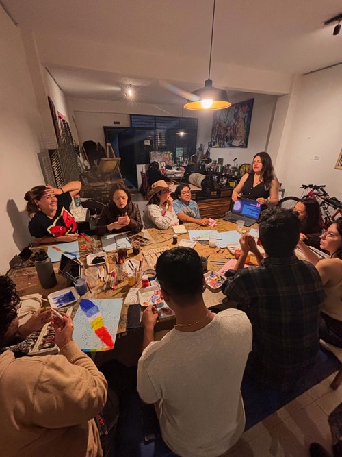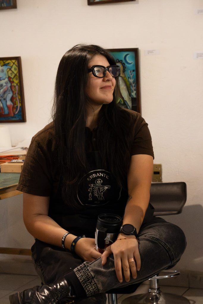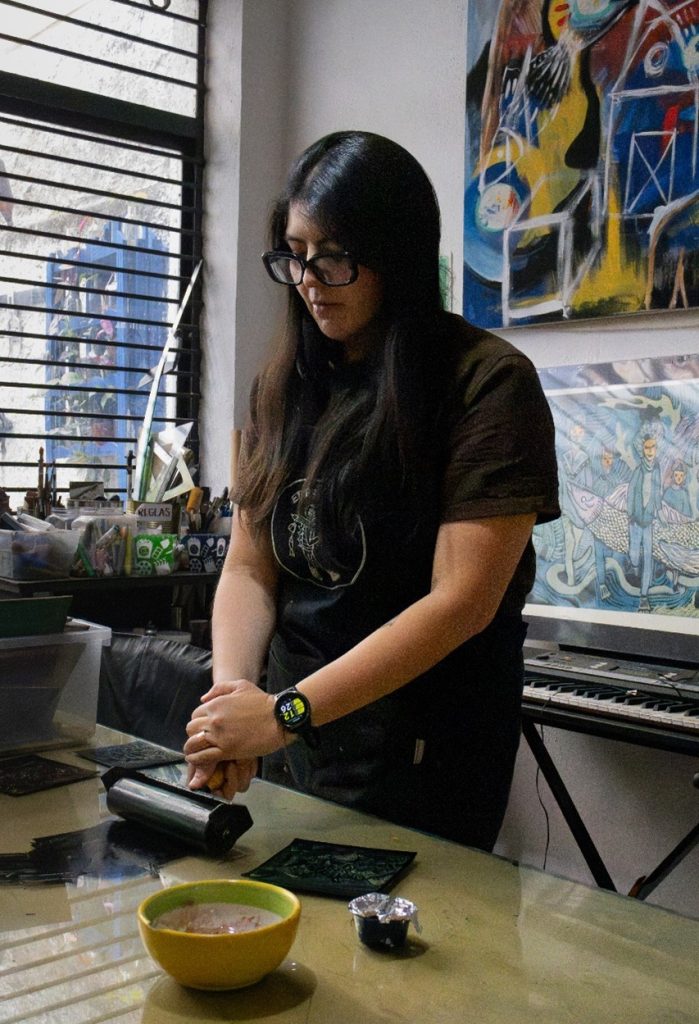 José Roberto Morales Ochoa Para entrar en el universo artístico llamado Grabado es fundamental empezar por distinguir qué es grabado, y por ello, consultando el glosario especializado de Editorial Artes y Letras*, tenemos que se trata de una técnica de impresión que consiste en transferir una imagen trabajada con instrumentos cortantes o mediante procesos químicos sobre una matriz rígida, para que la tinta alojada en sus incisiones se transfiera después, por presión, al papel o la tela. Una herida calculada en la materia que se convierte, al final, en imagen. Es justamente ese proceso de estampación y reproductividad, que ha transformado nuestra civilización con sus coetáneos como la imprenta y otras técnicas utilitarias como la serigrafía, y que ha cautivado a artistas a lo largo de la historia: Durero, Rembrandt, Goya, José Guadalupe Posada, Celia Calderón, quienes han dejado huella a través de la litografía, las placas de cobre, la xilografía y otras técnicas que conforman este gran universo; es en este mundo en el que Geraldine Guillén ha centrado su trabajo profesional, su producción artística y sus sueños. El Taller de Gráfica Errante, es un espacio cultural que se ha construido a lo largo de años de trabajo sostenido, colectivo y manteniéndose independiente, es de esos que reúnen ambas cosas. Enclavado en un espacio que combina arte, café y comunidad en la ciudad de Morelia, este proyecto ha sabido trazar su propio camino cada vez más consolidado. ¿Quién es Geraldine Guillén? Geraldine Guillén González (Uruapan, 1992) es artista visual, grabadora y maestra en Historia, egresada de la Facultad Popular de Bellas Artes de la UMSNH. Su trayectoria destaca por participaciones en la Bienal Olga Costa, la Bienal FEMSA y el Concurso de Pintura y Estampa Efraín Vargas, además de dos exposiciones individuales en el Instituto de Arte y Cultura de Celaya, Gto. Actualmente combina su producción gráfica y audiovisual con una investigación historiográfica sobre las mujeres de la estampa michoacana, reafirmando su compromiso con el grabado, no solo como práctica artística, sino por sus cualidades de colectividad y propósitos sociales, reconocidos históricamente. Fotografía: Geraldine Guillén en entrevista (Crédito: Metzli Zahori Valle Madrigal) Conversando con la artista, en compañía de su perruna compañera Marla, nos comparte que su trayectoria académica tiene algo de laberinto y azar afortunado. Se recuerda a sí misma como alguien con muchas cualidades artísticas, tomando clases de música y otros talleres relacionados – Mi primer encuentro con las artes fue en la infancia, pero ya un poco como más formal, fue en la preparatoria. cuando tuve clases con el maestro Samuel Díaz. Después de eso, pasaron algunos años porque me dediqué... Bueno, en realidad me gustaban todas las artes, ¿no? O sea, tocaba la guitarra, me gustaba cantar, me gustaba mucho dibujar, pintar – Ingresó a la Facultad Popular de Bellas Artes con la intención de dedicarse al cine y la animación. Sin embargo, la lógica analógica del dibujo y la pintura la fue seduciendo poco a poco. Estando ahí dije: igual no me encanta estar tantas horas en una computadora, recuerda. Fue entonces que, tomó un curso de grabado en la MAPECO —como se conoce familiarmente a la escuela Manuel Pérez Coronado de Uruapan—, lo que influyó de manera importante en su vida. Ahí comenzó su vida en la gráfica. Después vendrían talleres con artistas destacados como Artemio Rodríguez, Julián Guerrero, Job Solórzano y Nancy Valdés, les reconoce como mentores importantes. Concluyó su licenciatura en Artes Visuales en la Facultad Popular de Bellas Artes y posteriormente ingresó a la maestría en Historiografía en la Facultad de Historia de la UMSNH, de la cual está próxima a titularse. La placa perdida, tiene mucho de tradición en Uruapan Interrogamos a Geraldine sobre su definición de gráfica y grabado, a lo que nos respondió — Técnicamente, la gráfica es el acto de dibujar; desde ahí comienza su definición. Sin embargo, cuando hablamos del grabado o de las técnicas de la estampa, nos referimos a la creación de una imagen a partir de una matriz que permite su reproducción múltiple. No es lo mismo hablar de grabado que de estampa. La estampa abarca diversas técnicas como la litografía, la serigrafía, el grabado en relieve o el huecograbado. En cambio, el grabado se refiere específicamente al proceso de realizar un corte o incisión sobre una placa, que luego puede ser utilizada para generar impresiones. La parte emotiva de esta entrevista nos comparte que en un sentido más amplio y personal, la originaria de Uruapan – para mí ya es un estilo de vida no concibo ya mi vida sin la gráfica porque es mi trabajo, es lo que hago todos los días, es a lo que me dedico desde hace muchísimos años. O sea, de alguna forma, pues, hago gráfica desde que comencé a dibujar. Entonces, eso ha sido desde siempre, o sea, desde que tengo memoria. Esto lo descubrí mediante un curso de grabado en la MAPECO y fue cuando realmente me metí como al mundo de las artes gráficas, empezando por el grabado en relieve, que es lo que me encanta. O sea, mi técnica favorita es la placa perdida, que esos son mis meros moles, el grabado en relieve a color. Hago placa perdida como mi única forma de anclarme todavía a Uruapan. Es algo que nos identifica a los artistas uruapenses. Me gusta la técnica, pero también por el significado que le doy. Fotografía: Geraldine nos muestra procesos (Crédito: Metzli Zahori Valle Madrigal) Errante, porque se encuentra donde ella se encuentre El nombre del taller no es casual. Es errante porque ha estado en muchas partes, –explica Geraldine– Yo siempre he dicho que el taller se encuentra donde me encuentre yo. Comenzó en su cuarto de estudiante, imprimiendo con una cuchara sobre placas trabajadas en condiciones austeras. Pasó por la Cas