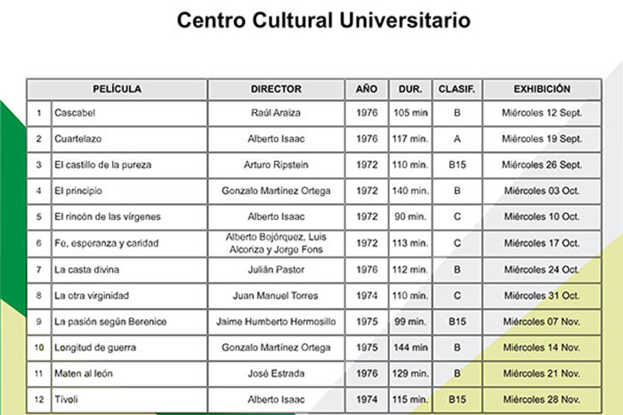 Jessica Chávez/La Voz de Michoacán Morelia, Michoacán. La Universidad Michoacana de San Nicolás de Hidalgo, en coordinación con la Cineteca Nacional lleva a cabo en las instalaciones del Centro Cultural Universitario el “Ciclo de cine mexicano de los años setenta”. Las proyecciones de buen cine, con directores de fama internacional y temática para todos los gustos de filmes clásicos en materia del arte cinematográfico mexicano, se llevan a cabo los miércoles de cada semana a las 18:00 horas en el auditorio nicolaita de este espacio de difusión cultural hasta el 28 de noviembre. Para el próximo 3 de octubre se proyectará la cinta “El principio” del director Gonzalo Martínez Ortega, protagonizada por Lucha Villa, Narciso Busquets y Sergio Bustamante en los principales papeles. La cinta narra que a su regreso de París, donde estudió música por nueve años, el joven David se encuentra a su natal Chihuahua inmersa en el agitado preludio del estallido revolucionario. A través de recuerdos evocará pasajes de la violenta realidad que provocó su tragedia familiar a principios de siglo. Influido por el cine épico de la Unión Soviética, Gonzalo Martínez Ortega (Longitud de guerra, 1976) filmó esta ópera prima en locaciones del estado de Chihuahua, con la que obtuvo el Ariel de Oro en 1974. El miércoles 10 de octubre se exhibirá “El rincón de las vírgenes”, dirigida por Alberto Isaac, guión de Alberto Isaac, inspirado en los relatos el día del derrumbe y Anacleto Morones de Juan Rulfo, con la actuación de Emilio “el Indio” Fernández y Alfonso Arau. La película está inspirada en un par de relatos incluidos en el llano en llamas de Juan Rulfo, Alberto Isaac narra las desventuras del curandero Anacleto Morones, quien recorrió los paisajes de Comala salvando almas a través del placer. Con mucho sentido del humor, buenas dosis de sensualidad y la presencia de algunas míticas personalidades del cine mexicano clásico como protagonistas, Isaac orquesta una excepcional comedia que se asoma al universo rulfiano sin el tono trágico acostumbrado. El miércoles 17 toca el turno a “Fe, esperanza y caridad”, bajo la dirección de Alberto Bojórquez, actuación de Fabiola Falcón (Teresa), Armando Silvestre (Artemio), David Silva (Melitón) y Roberto Ramírez Beto el boticario (Filogonio) entre otros. Teresa es una mujer a cargo de sus tres hijos y de Filogonio, su esposo paralítico, quien atiende una miscelánea junto con su suegra. Filogonio está celoso del constante acecho hacia su mujer por parte de varios hombres; Teresa decide emprender un viaje al santuario de Chalma, en donde pedirá por la recuperación de su esposo; sin embargo, en el camino también se encontrará con numerosos hombres. “La casta divina” se proyectará el 24 de octubre, el filme está inspirado en textos de Salvador Alvarado sobre el régimen casi feudal de la "Casta divina" en el Yucatán de principios de siglo XX. En el argumento, Wilfrido es un maduro terrateniente que invoca el derecho de pernada sobre las indias del lugar y es sumamente violento con todos, incluso con Elidé, su bella hija. Él decide enviar a Efrén, otro de sus hijos, a luchar junto el general Abel Ortiz Argumedo contra las tropas del general Alvarado, la misión será buscar la independencia de Yucatán. El filme fue dirigido por Julián Pastor,guión de Eduardo Luján y cuenta con la participación de Ignacio López Tarso (don Wilfrido), Ana Luisa Peluffo (Tulita), Pedro Armendáriz Jr. (coronel Abel Ortíz Argumedo) y Tina Romero. Finalmente el miércoles 31 de octubre se expondrá el drama “La otra virginidad”, dirigida por Juan Manuel Torres, con la actuación de Valentín Trujillo, Leticia Perdigón, Arturo Beristáin, Víctor Manuel Mendoza, Eduardo Noriega y Rita Macedo. Laura y Eva son meseras en un restaurante, se relacionan con Adrián, un repartidor de películas cuyo padre lo trata con dureza mientras que a Luis, amigo de Adrián, que vive temporalmente en la casa, lo trata con afecto. Por otro lado, a través de una revista de anuncios, tres viejos se divierten citando a mujeres solas en una cafetería y apostando cuánto tiempo esperarán. Todas las funciones son con entrada libre y la clasificación es para adolescentes y adultos o sólo adultos.