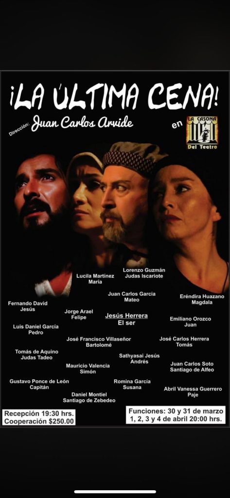 Monserrat Cervantes / La Voz de Michoacán Morelia, Michoacán.- La Casona del Teatro presenta su próximo espectáculo “La última cena”. La obra se cataloga como un collage teatralizado, basada en pasajes bíblicos que han sido previamente estudiados, recopilados y reestructurados por el director Juan Carlos Arvide, en colaboración con César Gabriel Silva. Sinopsis En esta representación, en un acto, se aborda el tema desde un aspecto histórico reflexivo, donde se muestra un Jesús natural, humano y en confrontación consigo mismo ante su eminente calvario, que, si bien puede ser verdad o no, también está rodeado de misterio. Es una recopilación de textos bíblicos del dominio público, de lo que es o fue posible y probable que sucediera, ya que esta representación no tiene por objetivo reforzar ningún credo especifico, sino mostrar desde la perspectiva teatral, la vida de Jesús que es el personaje de perscnajes. Obra que ha sido representada en la Plaza Valladolid, además de varios espacios públicos del interior del Estado y La Casona del Teatro, con una gran aceptación, durante nueve (9) años consecutivos. Por medio de rueda de prensa se presentó a los actores que darán vida a los distintos personajes que conforman la obra. Elenco: Fernando David – Jesús Jesús Herrera – El Ser Lucila Martínez – María Lorenzo Guzmán – Judas Iscariote Juan Carlos García – Mateo Eréndira Huazano – Magdala Jorge Arael – Felipe Luis Daniel García – Pedro Emiliano Orozco – Juan José Carlos Herrera – Tomás Tomás de Aquino – Judas Tadeo José Francisco Villaseñor – Bartolomé Sathyasai Jesús – Andrés Mauricio Valencia – Simón Juan Carlos Soto – Santiago de Alfeo Gustavo Ponce de León – Capitán Romina García – Susana Daniel Montiel – Santiago de Zebedeo Abril Vanessa Guerrero – Paje Las funciones se llevarán a cabo en La Casona del Teatro, ubicada en la calle Aquiles Serdán #35, en la colonia Centro de Morelia. Fechas: Marzo: 30 y 31 Abril: 1, 2, 3 y 4 La recepción del evento será a las 19:30 horas, para dar inicio a la función a las 20:00 horas. El costo de entrada será de 250 pesos por persona. Función especial La obra también contará con una función especial que será presentada en el Teatro Melchor Ocampo, con entrada libre. Fecha: Abril 11 Horario: Recepción: 19:00 horas Inicio de la obra: 19:30 horas Los boletos para esta función especial pueden adquirirse en La Casona del Teatro, en un horario de 16:00 a 18:00 horas, de lunes a viernes.