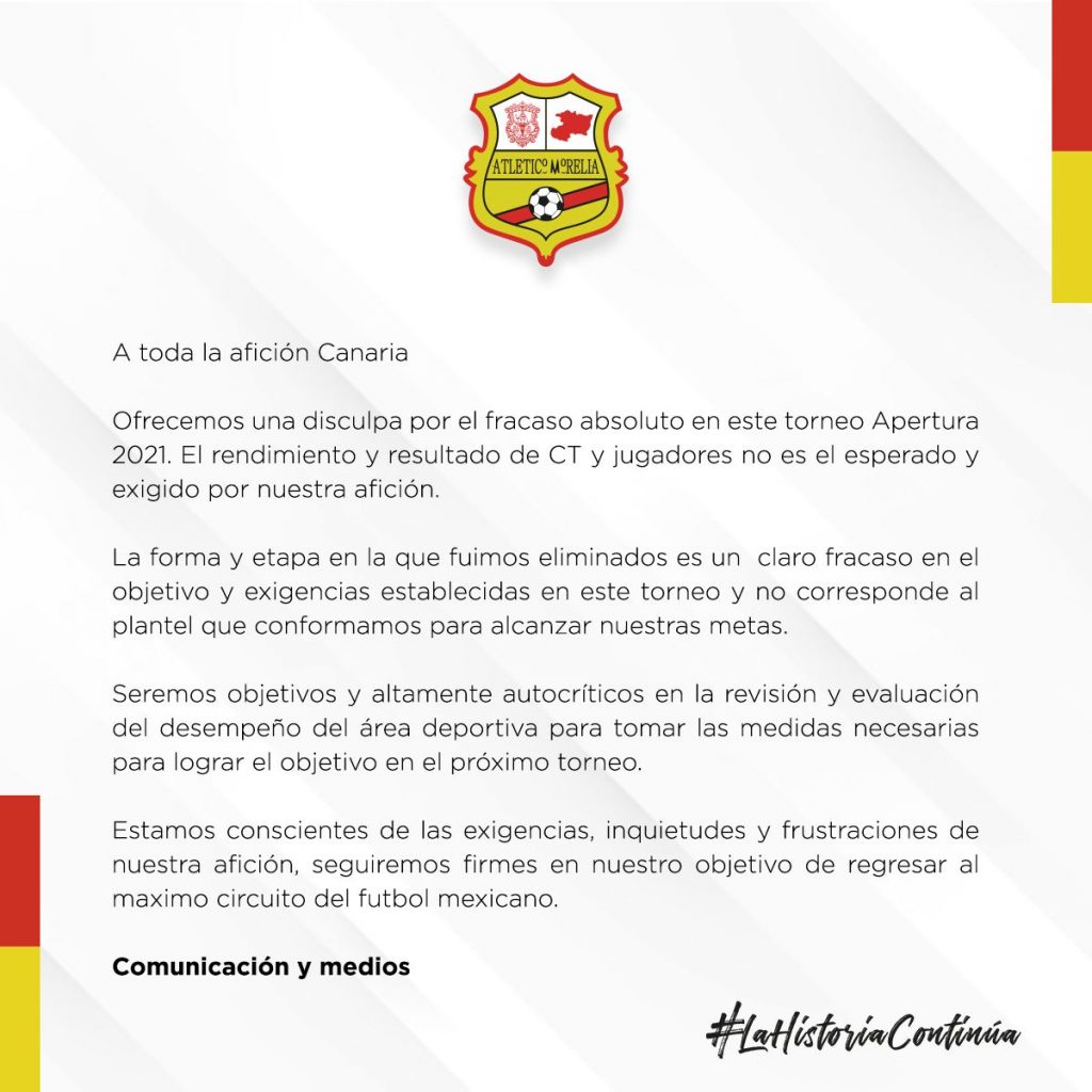 Redacción / La Voz de Michoacán Morelia, Michoacán. Luego de quedar eliminados ante el Tampico Madero en los cuartos de final de la liga de Expansión, y en donde el Atlético Morelia no pudo hacer valer la localía para avanzar en la liguilla, la directiva de los michoacanos se pronunció este domingo. A través de un comunicado, ofrecieron una disculpa por el fracaso absoluto en el torneo Apertura 2021 y admitieron que el rendimiento y el resultado del cuerpo técnico y de los jugadores no es el esperado y exigido por la afición. Señalaron que la forma y etapa en la que fueron eliminados es un claro fracaso en el objetivo y exigencias establecidas este torneo y no corresponde al plantel que conformaron para alcanzar las metas establecidas. Seremos objetivos y altamente autocríticos en la revisión y evaluación del desempeño del área deportiva para tomar las medidas necesarias para lograr el objetivo el próximo torneo.