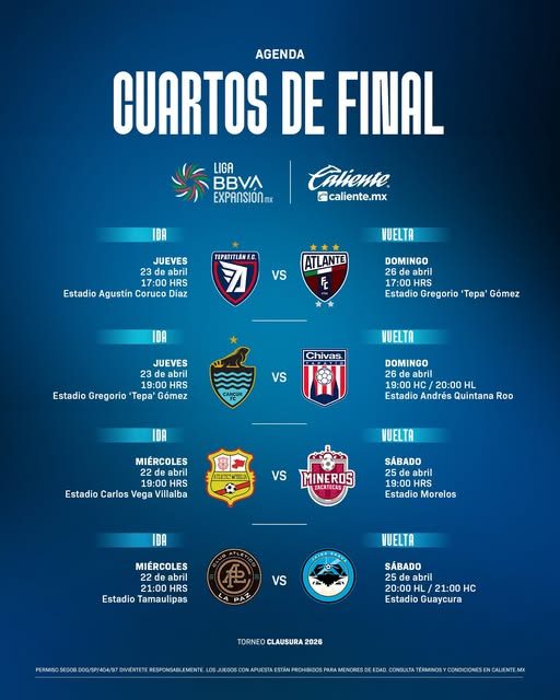 Calendario oficial de la Liga de Expansión con los cruces de Cuartos de Final del Torneo Clausura 2026.
