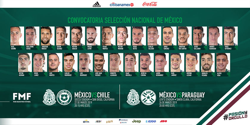 Redacción / La Voz de Michoacán Ciudad de México. La Dirección de Selecciones Nacionales da a conocer la lista de jugadores convocados por el Director Técnico de la Selección Nacional de México, Gerardo Martino, para los partidos de la próxima Fecha FIFA ante Chile y Paraguay, de los días 22 y 26 de marzo en San Diego y Santa Clara, respectivamente. Convocados Guillermo Ochoa – Standard Lieja Héctor Moreno – Real Sociedad Andrés Guardado – Real Betis Diego Lainez – Real Betis Diego Reyes – Leganés Néstor Araujo – Celta de Vigo Jonathan Dos Santos – LA Galaxy Erick Gutiérrez – PSV Eindhoven Hirving Lozano – PSV Eindhoven Raúl Jiménez – Wolverhampton FC Javier Hernández – West Ham United Jesús Corona – Porto FC Edson Álvarez – América Jorge Sánchez – América Roberto Alvarado – Cruz Azul Jesús Gallardo – Monterrey Rodolfo Pizarro – Monterrey Miguel Layún – Monterrey César Montes – Monterrey Carlos Rodríguez – Monterrey Víctor Guzmán – Pachuca Jonathan Orozco – Santos Laguna José Juan Vázquez – Santos Laguna Carlos Salcedo – Tigres Luis Rodríguez – Tigres Alexis Vega – Guadalajara Raúl Gudiño – Guadalajara Isaac Brizuela – Guadalajara Luis Montes – León Itinerario La concentración dará inicio el domingo 17 de marzo en el Aeropuerto de la Ciudad de México, para realizar el viaje a San Diego esa misma tarde. Los jugadores que participan en ligas de Europa y Estados Unidos se integrarán al equipo en San Diego. En San Diego se trabajará hasta el domingo 24 de marzo, día que se realizará el traslado a Santa Clara. Partidos Fecha FIFA marzo México vs. Chile Viernes 22 de marzo, 2019 19:15 hrs. (L) 20:15 hrs. (CM) SDCCU Stadium San Diego, California México vs. Paraguay Martes 26 de marzo, 2019 19:00 hrs. (L) 20:00 hrs. (CM) Levi’s Stadium Santa Clara, California