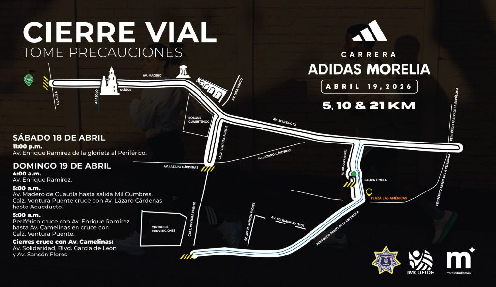 Morelia hoy. El Ayuntamiento de Morelia, a través del Instituto Municipal de Cultura Física y Deporte (Imcufide) y en coordinación con diversas corporaciones de auxilio y seguridad, brindará respaldo logístico y operativo para la realización de la Carrera Adidas 5K, 10K y 21K, programada para el próximo domicilio 19 de abril, con el objetivo de garantizar un evento ordenado y seguro para participantes y ciudadanía. Como parte del compromiso de la administración encabezada por el presidente municipal Alfonso Martínez Alcázar con el impulso al deporte y la activación física, distintas dependencias municipales participarán en labores de supervisión, vigilancia y atención preventiva, fortaleciendo así las condiciones para el adecuado desarrollo de este evento de carácter nacional. En este operativo colaboran Protección Civil, Bomberos, Policía Morelia, Cruz Roja, Guardia Civil y Pentatlón, quienes coordinarán acciones de seguridad, acompañamiento a atletas, y control de la movilidad, con el propósito de salvaguardar la integridad de las y los asistentes. Para facilitar el desarrollo de la carrera, se implementarán cierres parciales y totales en distintas vialidades, iniciando el sábado 18 de abril a las 23:00 horas con cierres parciales sobre avenida Enrique Ramírez, mientras que a partir de las 04:00 horas del domingo 19 de abril comenzarán los cierres totales y progresivos en las rutas contempladas. Las vialidades que tendrán afectaciones temporales serán Avenida Enrique Ramírez, Acueducto rumbo a Mil Cumbres, Acueducto-Madero hasta Cuautla, Lázaro Cárdenas en su cruce con Ventura Puente hacia Madero, así como el Libramiento en su cruce con Enrique Ramírez hacia Camelinas y Ventura Puente. La reapertura de estas vías se realizará de manera paulatina conforme avance el último corredor, iniciando en la zona del Acueducto hacia Mil Cumbres y posteriormente en el trayecto de Camelinas, estimando un tiempo máximo de dos horas para la normalización total de la circulación. Con estas acciones, el Gobierno Municipal refrenda su compromiso de seguir respaldando eventos que promuevan el deporte, la convivencia y el uso ordenado del espacio público, en beneficio de las y los morelianos. Redacción / La Voz de Michoacán