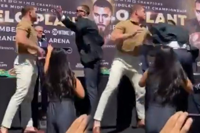 Agencias / La Voz de MichoacánLa primera conferencia de prensa entre Saúl Álvarez y Caleb Plant terminó a los golpes. El "Canelo" y el estadounidense se enfrascaron en un duelo verbal que pasó a los golpes después de que el tapatío empujó a Plant, quien respondió con un par de golpes, al igual que el mexicano. De hecho, Caleb resultó con un ligero corte en el pómulo derecho. https://twitter.com/premierboxing/status/1440416310614118410?ref_src=twsrc%5Etfw%7Ctwcamp%5Etweetembed%7Ctwterm%5E1440416310614118410%7Ctwgr%5E%7Ctwcon%5Es1_&ref_url=https%3A%2F%2Fwww.eluniversal.com.mx%2Funiversal-deportes%2Fbox%2Fconferencia-entre-canelo-alvarez-y-caleb-plant-termina-en-golpes Ambos fueron separados por sus respectivos equipos de trabajo. Álvarez y Plant se enfrentarán el 6 de noviembre en Las Vegas por ser el campeón absoluto de los supermedianos. "Canelo" expondrá los cetros del Consejo Mundial de Boxeo (CMB), la Asociación Mundial (AMB) y la Organización Mundial (OMB), mientras que Plant pondrá en juego el de la Federación Internacional (FIB). https://twitter.com/ShowtimeBoxing/status/1440415407345569797?ref_src=twsrc%5Etfw%7Ctwcamp%5Etweetembed%7Ctwterm%5E1440415407345569797%7Ctwgr%5E%7Ctwcon%5Es1_&ref_url=https%3A%2F%2Fwww.eluniversal.com.mx%2Funiversal-deportes%2Fbox%2Fconferencia-entre-canelo-alvarez-y-caleb-plant-termina-en-golpes